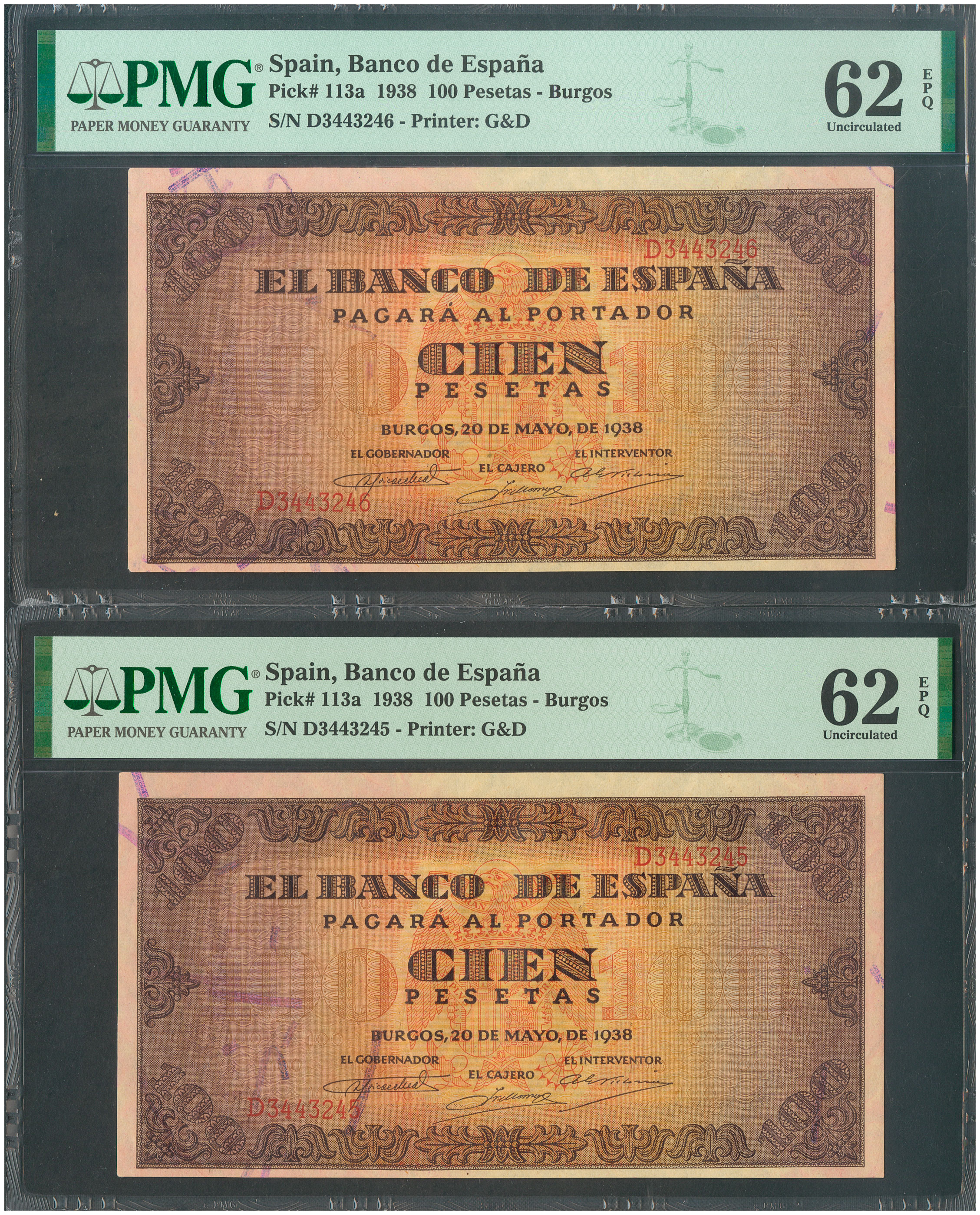 100 Pesetas. 20 de Mayo de 1938. Pareja correlativa. Serie D. (Edifil 2017: 432a). Muy rara pareja, especialmente en esta calidad y conservando todo su apresto original. SC. Encapsulados PMG62EPQ, ambos.