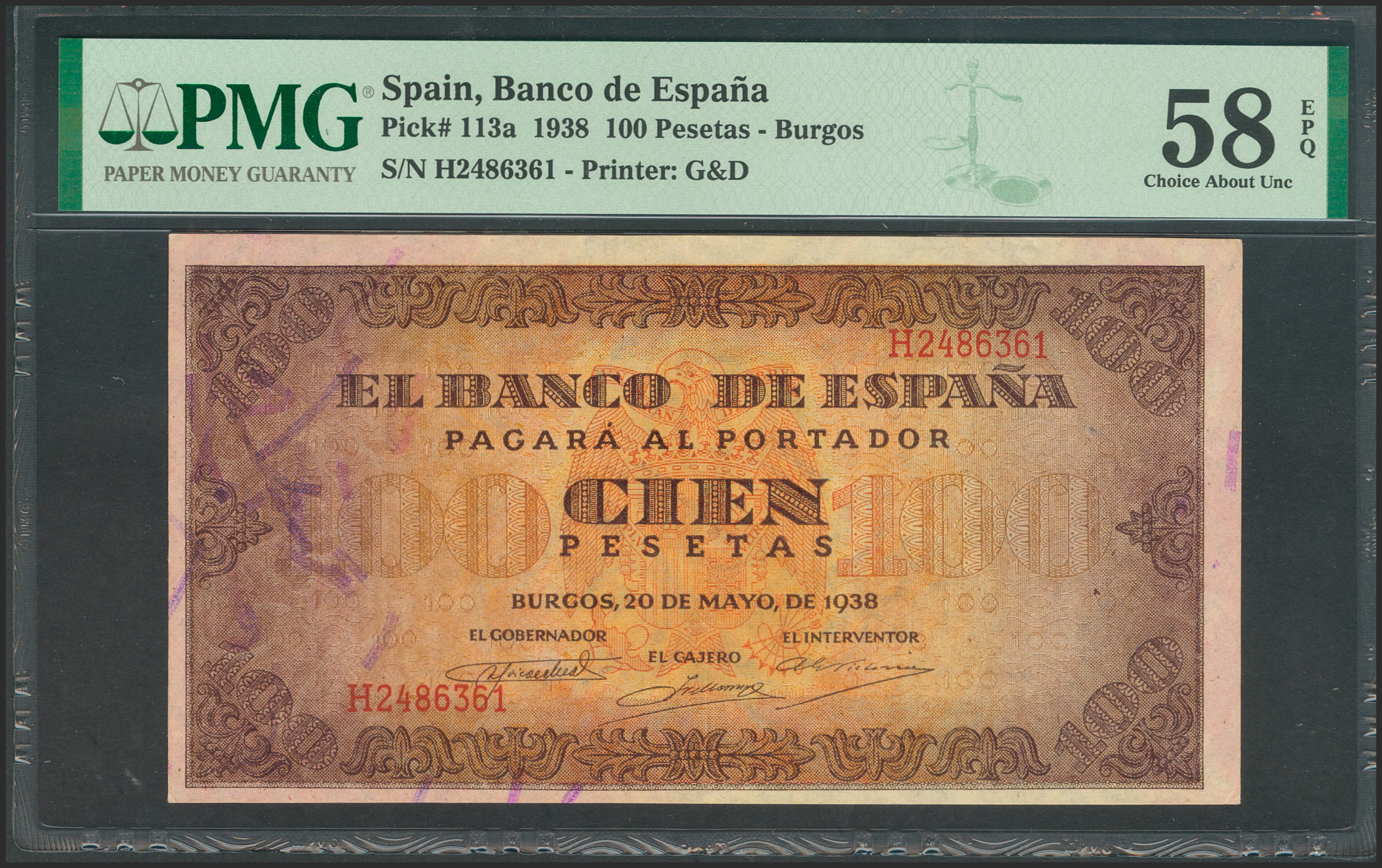 100 Pesetas. 20 de Mayo de 1938. Serie D. (Edifil 2017: 432a). Conserva todo su apresto original. EBC+. Encapsulado PMG58EPQ.
