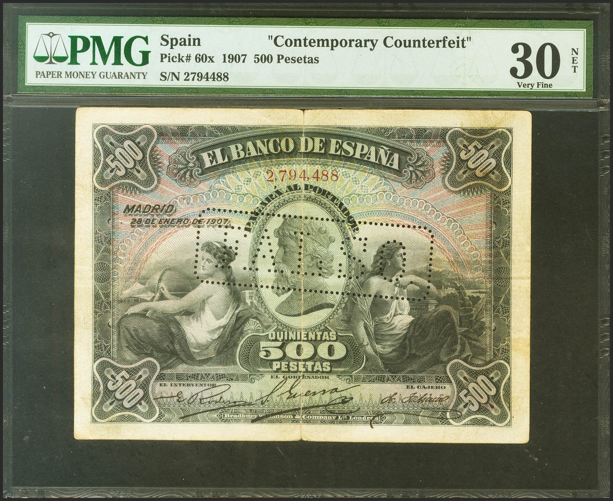 500 Pesetas. 28 de Enero de 1907. Falso de época. Sin serie y perforado FALSO. (Edifil 2021: 316, Pick: 60x). Reparado. MBC+. Encapsulado PMG30NET.