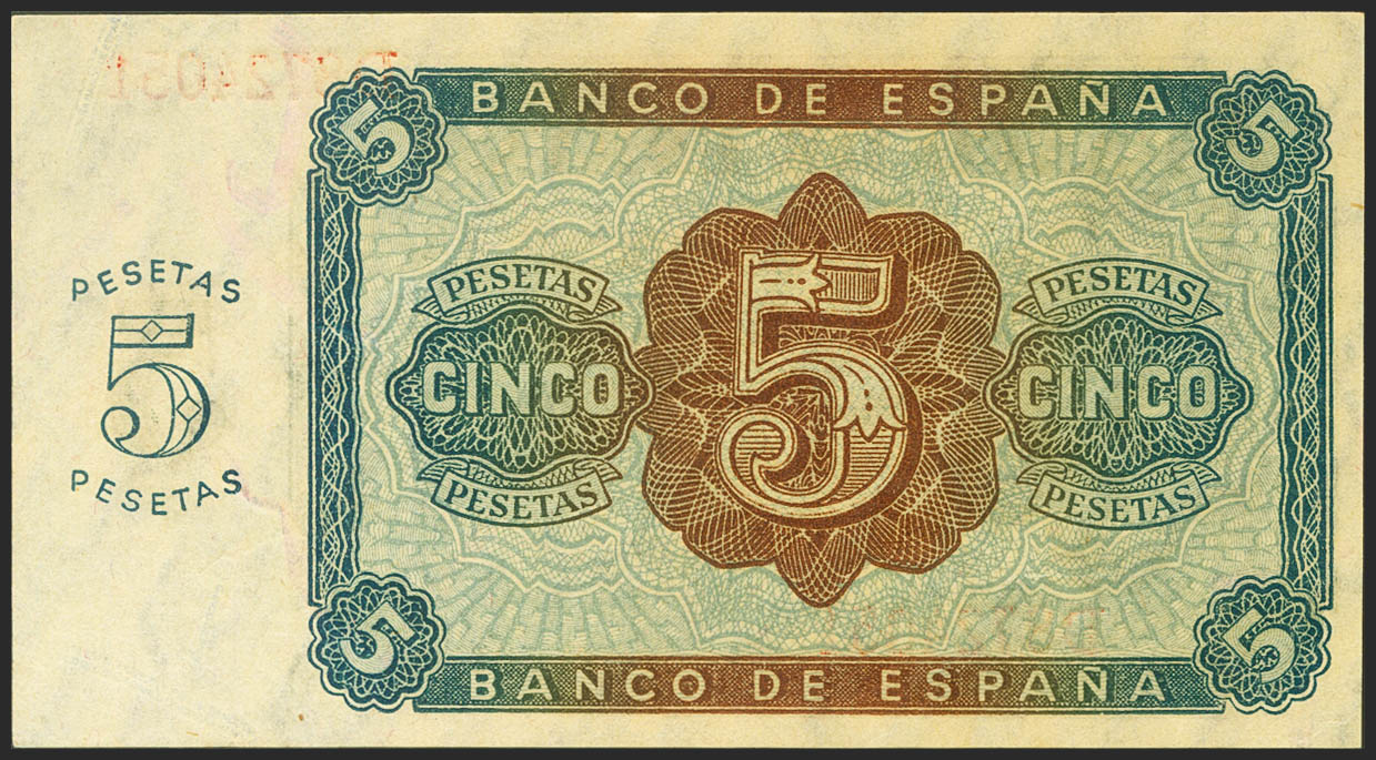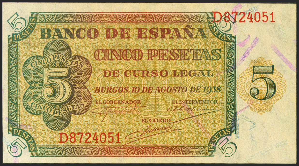 5 Pesetas. 10 de Agosto de 1938. Serie D. (Edifil 2021: 435a). Apresto original. SC.