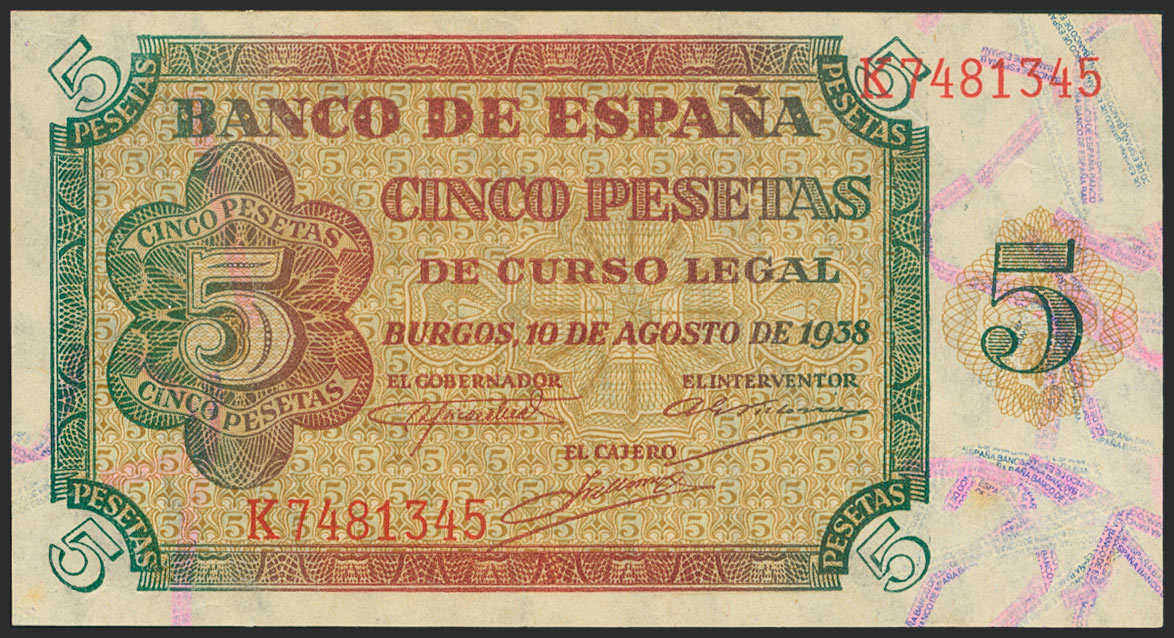 5 Pesetas. 10 de Agosto de 1938. Serie K. (Edifil 2021: 435a). Apresto original. SC-.