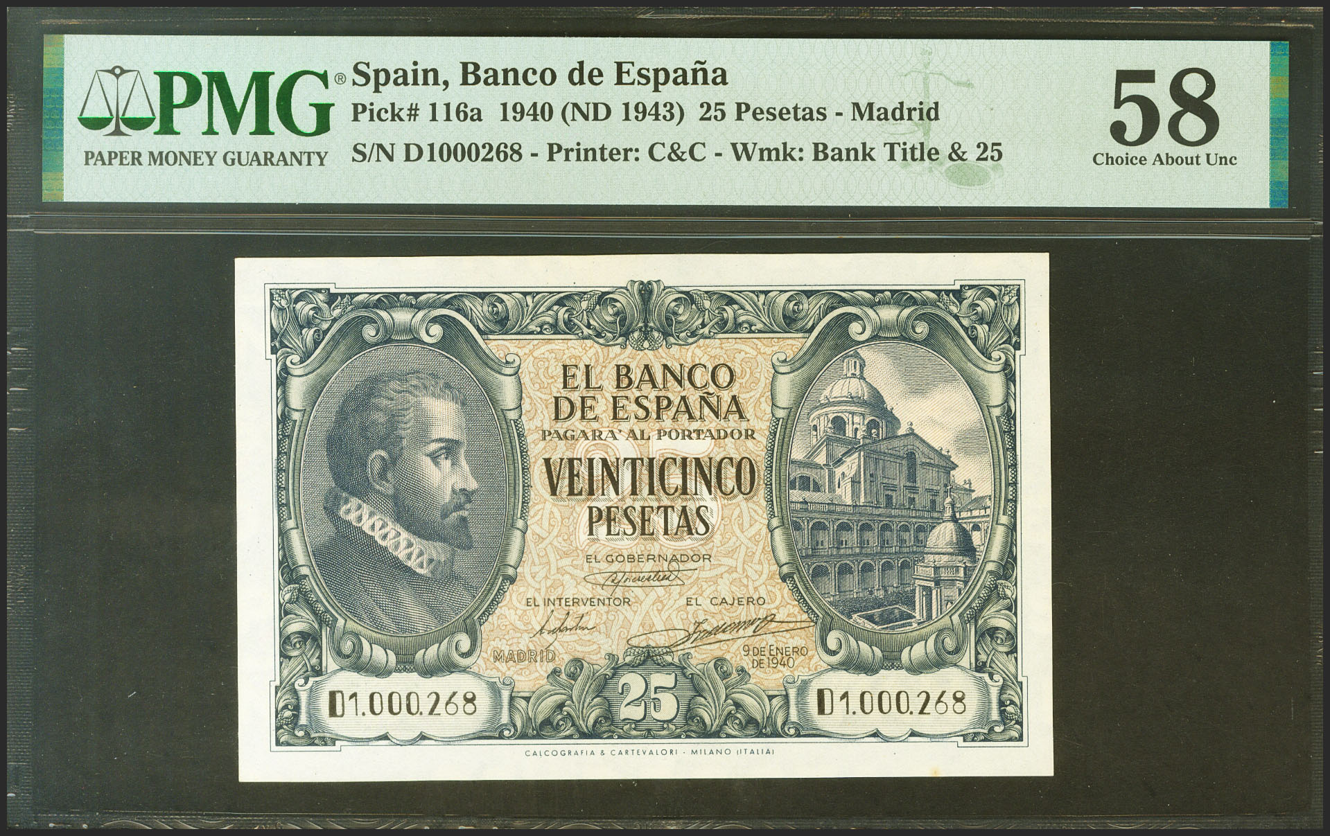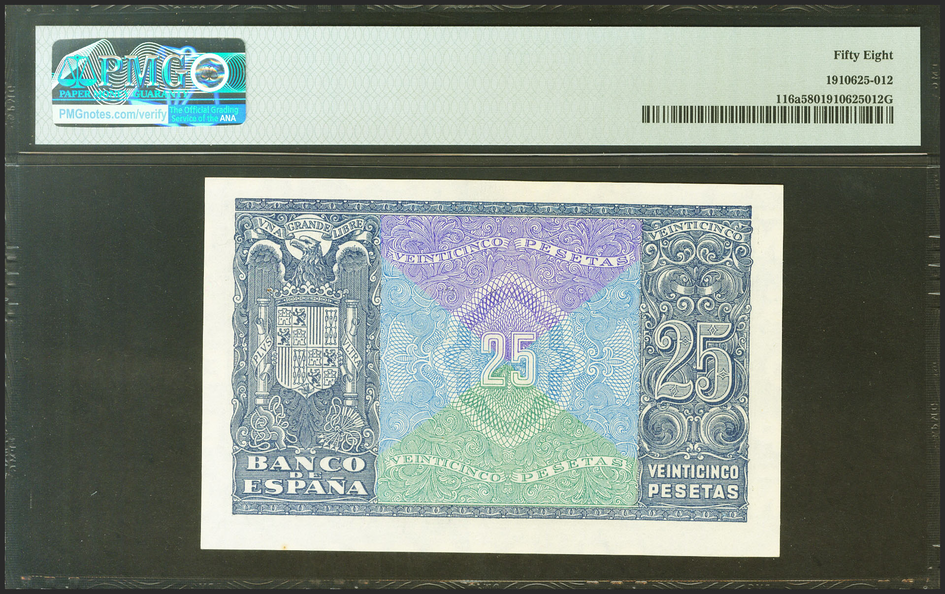 25 Pesetas. 9 de Enero de 1940. Serie D. (Edifil 2021: 436a, Pick: 116a). Inusual. EBC++. Encapsulado PMG58.