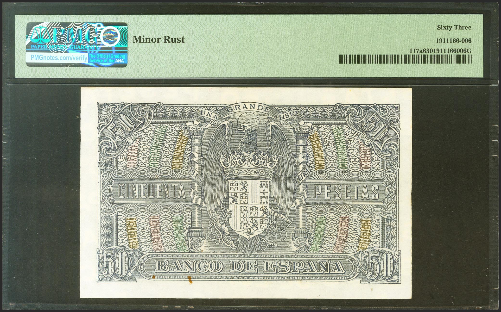 50 Pesetas. 9 de Enero de 1940. Serie B. (Edifil 2021: 437a, Pick: 117a). Manchitas de poca importancia. SC. Encapsulado PMG63.