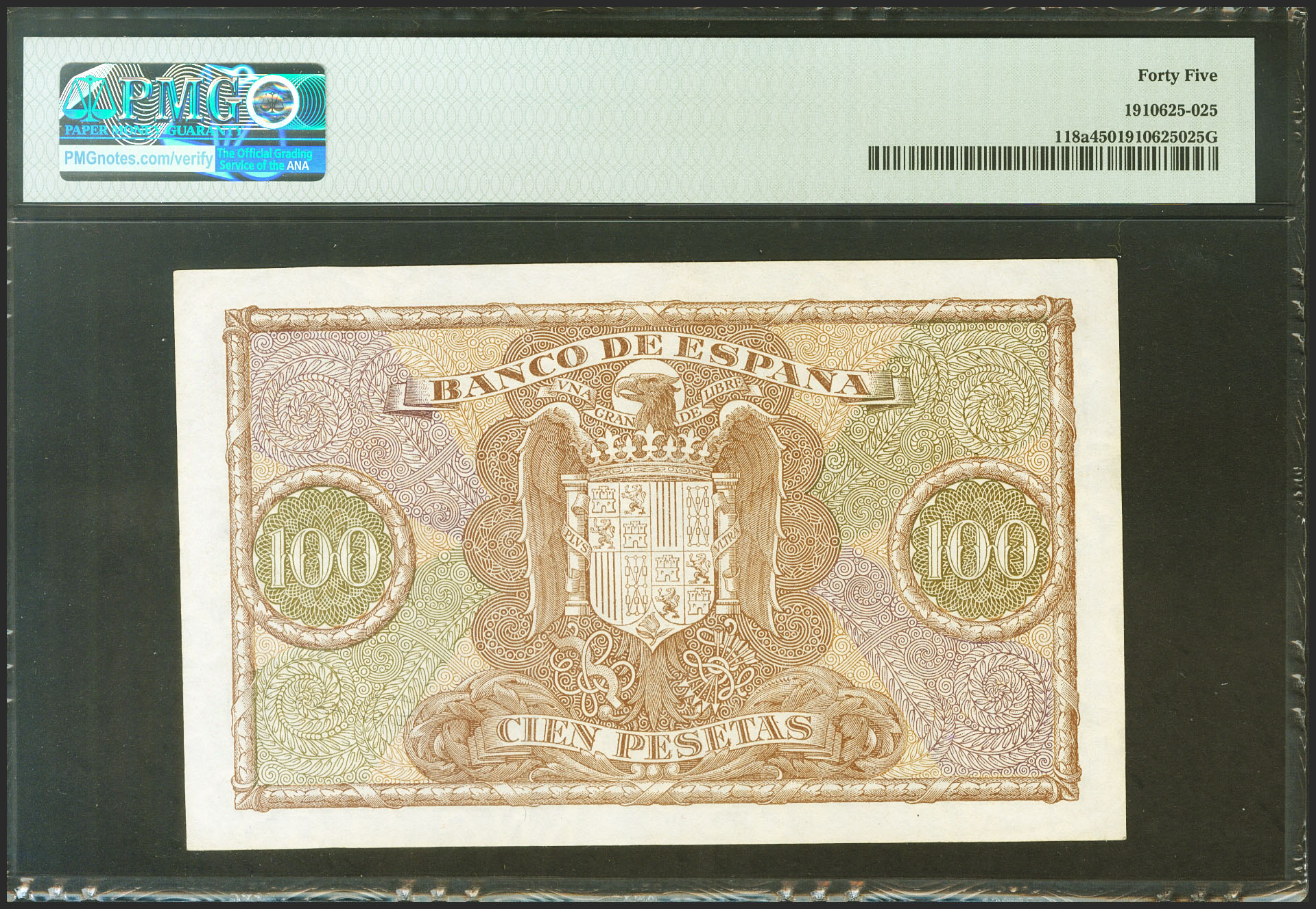 100 Pesetas. 9 de Enero de 1940. Serie A. (Edifil 2021: 438, Pick: 118a). Inusual. EBC-. Encapsulado PMG45.
