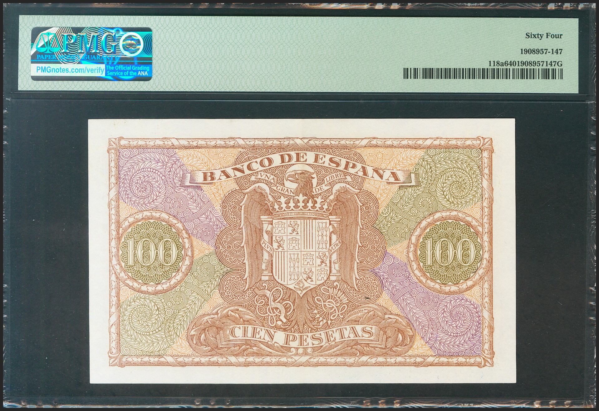 100 Pesetas. 9 de Enero de 1940. Serie E. (Edifil 2021: 438a, Pick: 118a). Inusual en esta calidad. SC. Encapsulado PMG64.