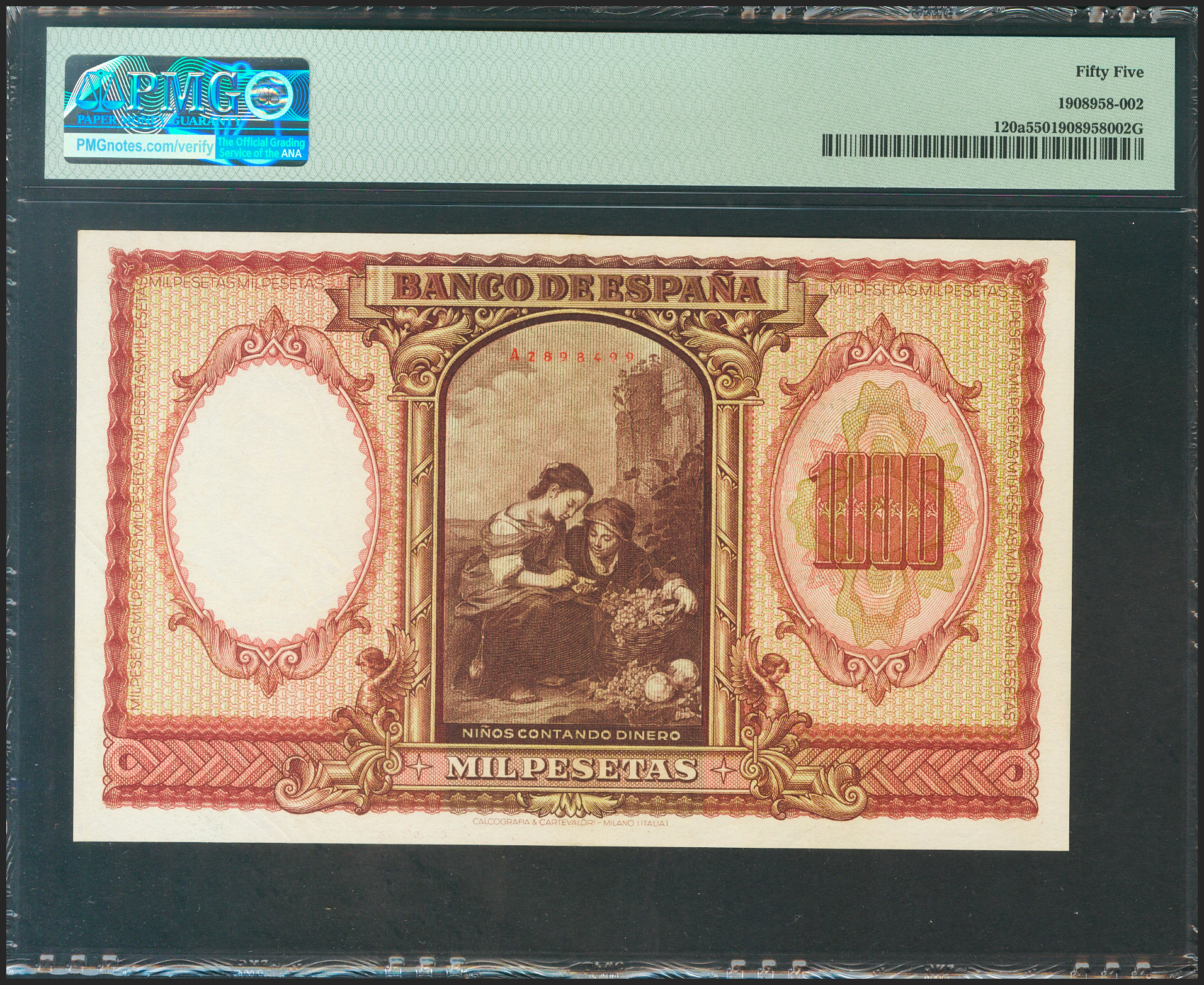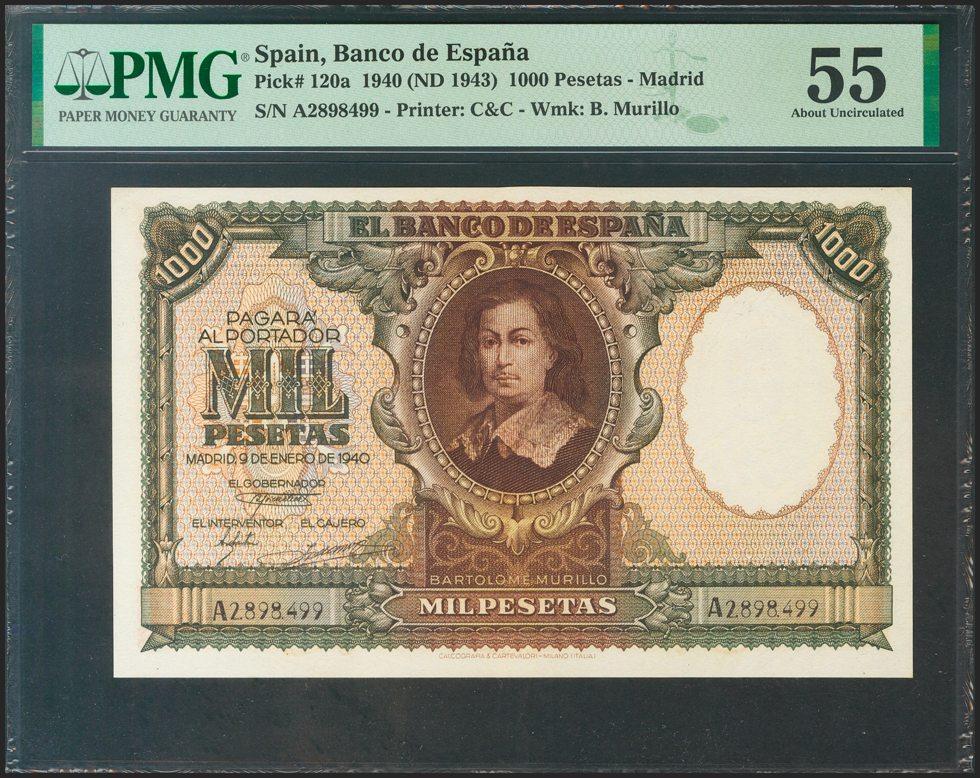 1000 Pesetas. 9 de Enero de 1940. Serie A. (Edifil 2021: 440, Pick: 120a). Raro en esta calidad. EBC+. Encapsulado PMG55.