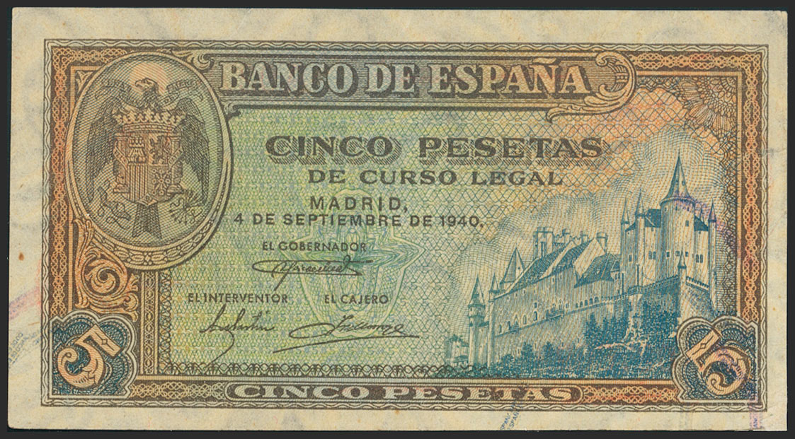 5 Pesetas. 4 de Septiembre de 1940. Serie A. (Edifil 2021: 443). Apresto original. SC-.