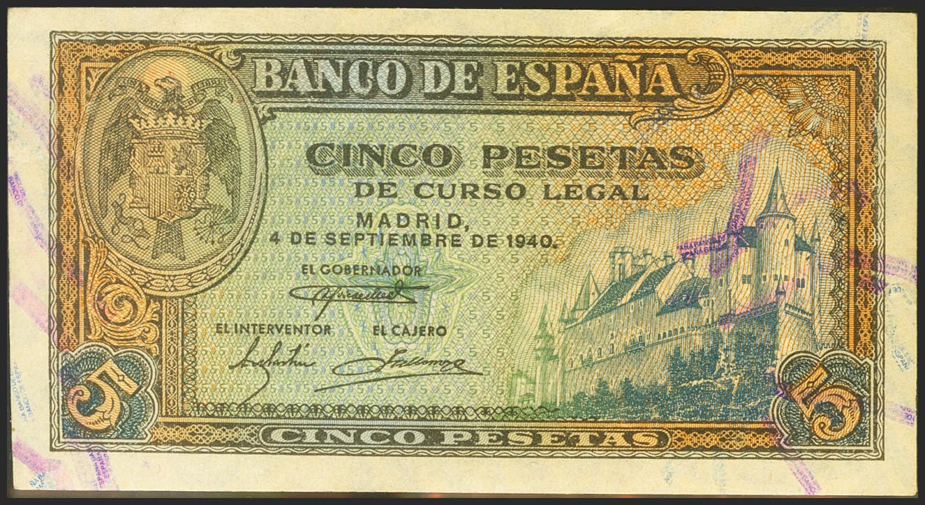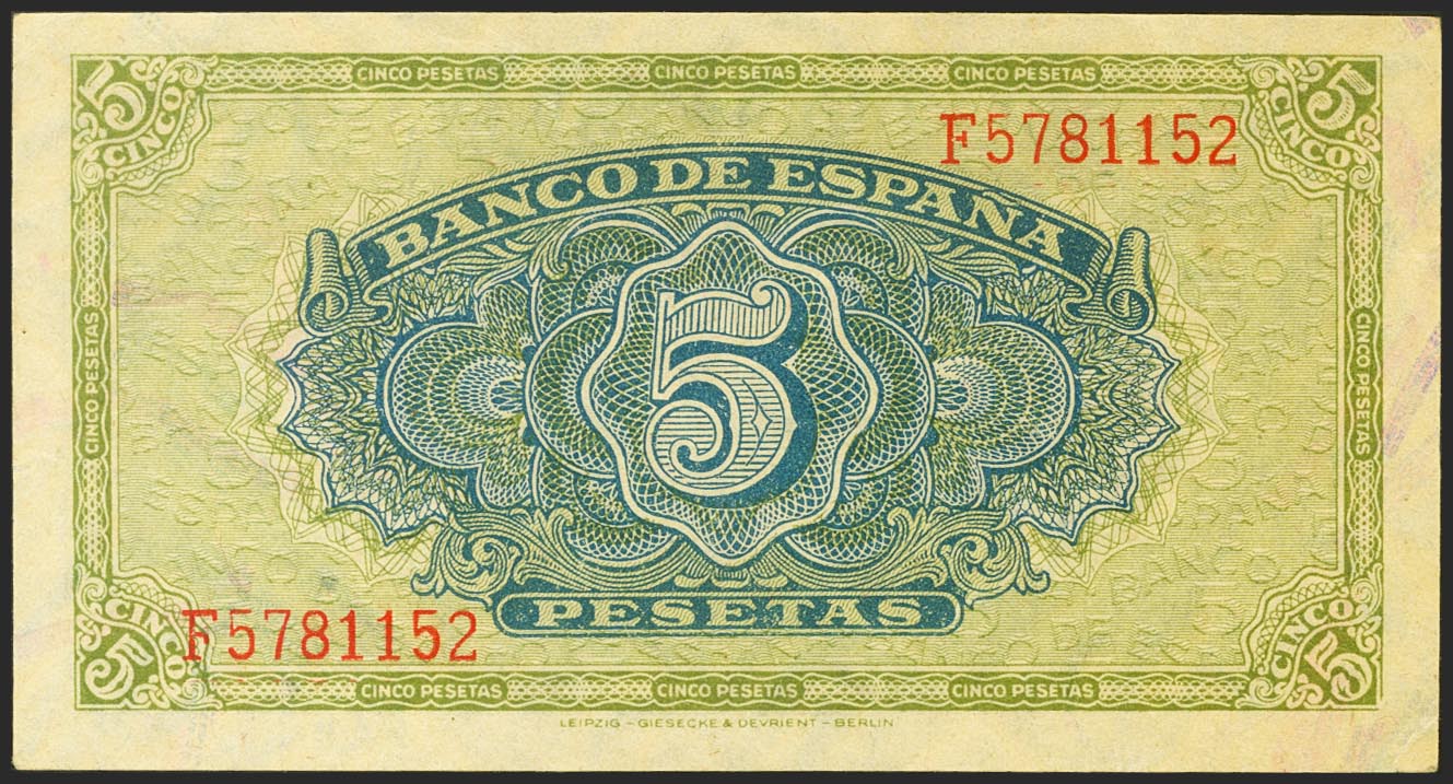 5 Pesetas. 4 de Septiembre de 1940. Serie F. (Edifil 2021: 443a). Apresto original. SC-.