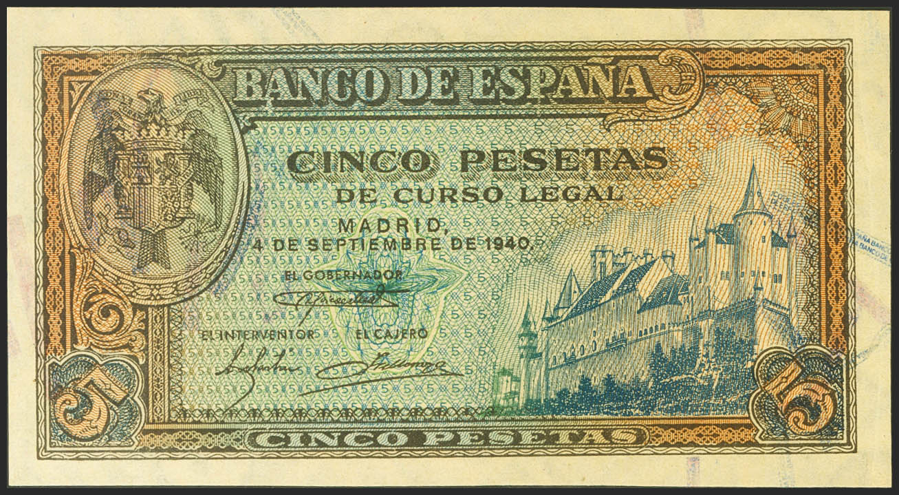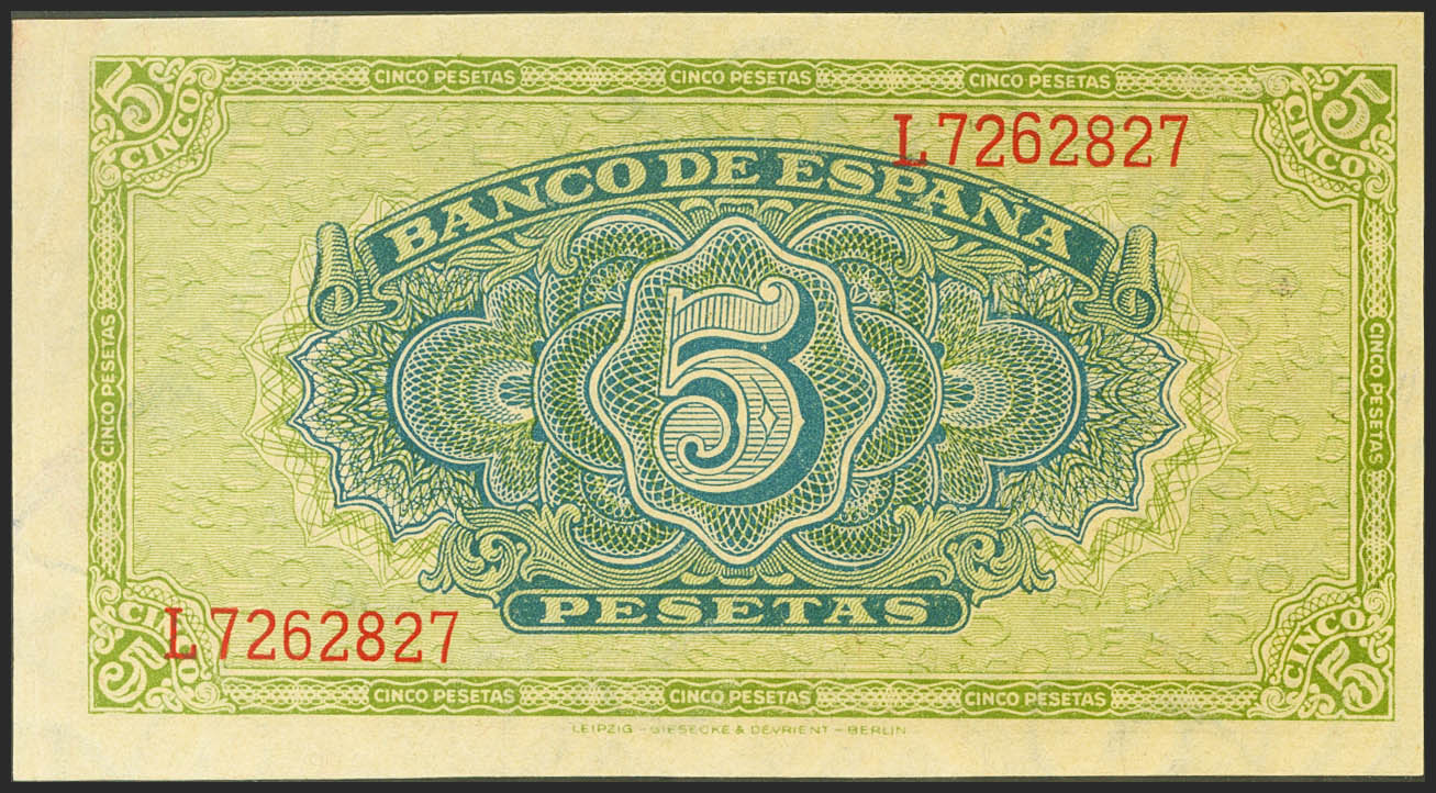 5 Pesetas. 4 de Septiembre de 1940. Serie L. (Edifil 2021: 443a). Conserva todo su apresto original. SC-.
