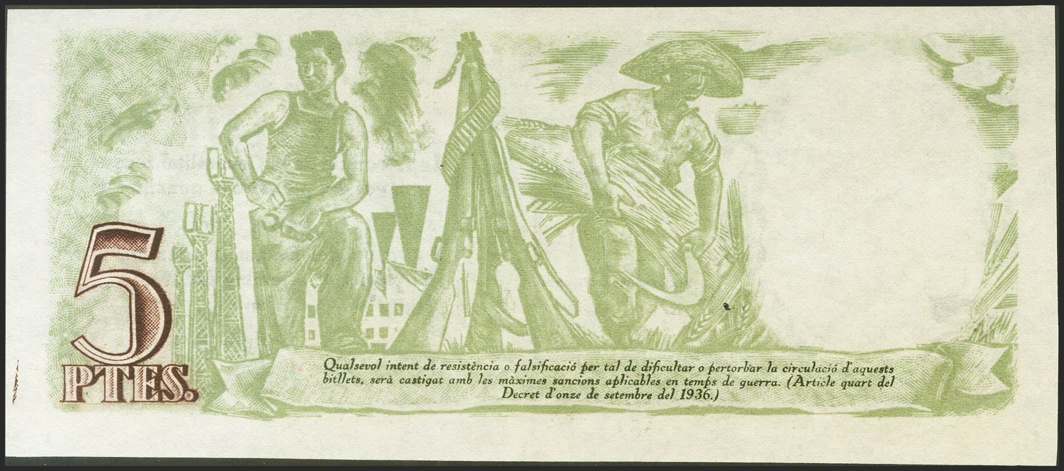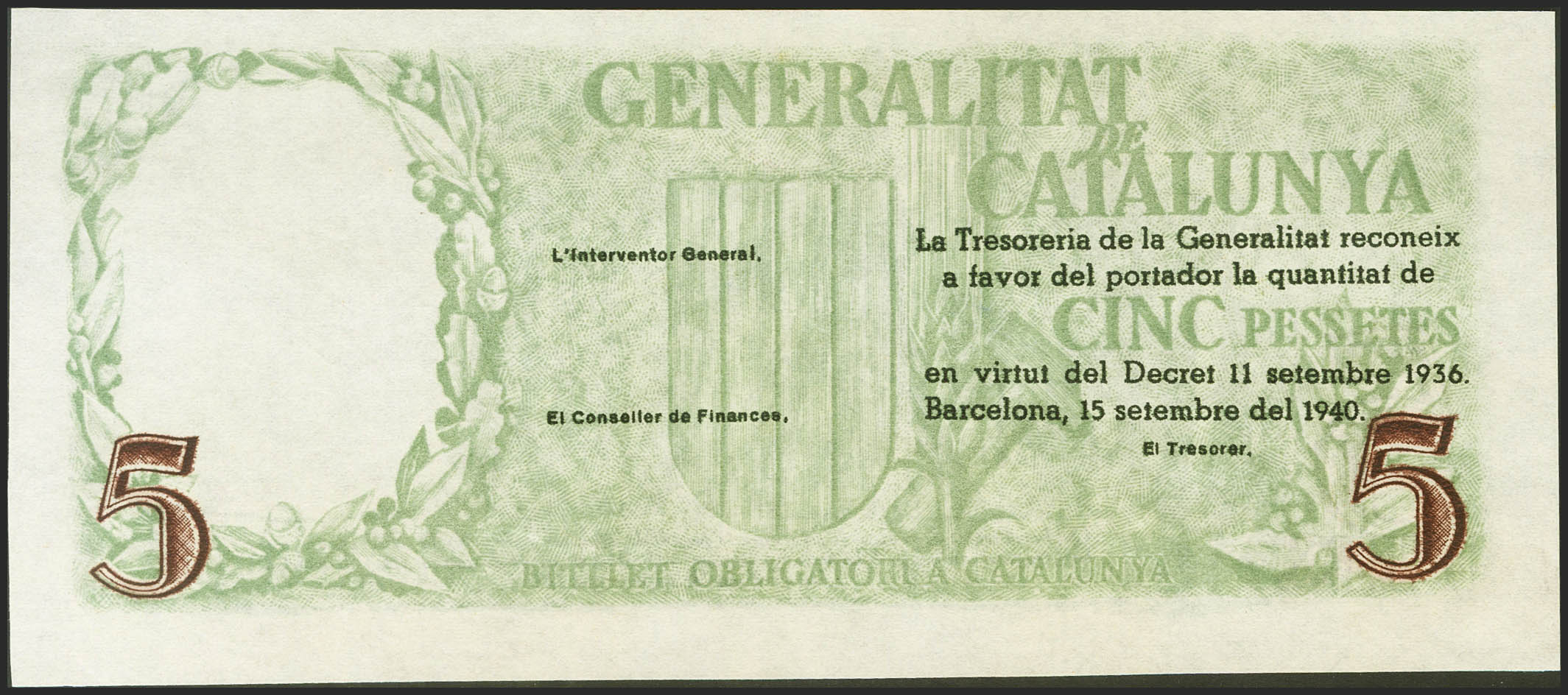 5 Pesetas. 15 de Septiembre de 1940. Prueba de anverso y reverso con el fondo en verde, sin numeración y sin firmas. (Edifil 2021: 373P). Muy interesante y rarísimo. SC.