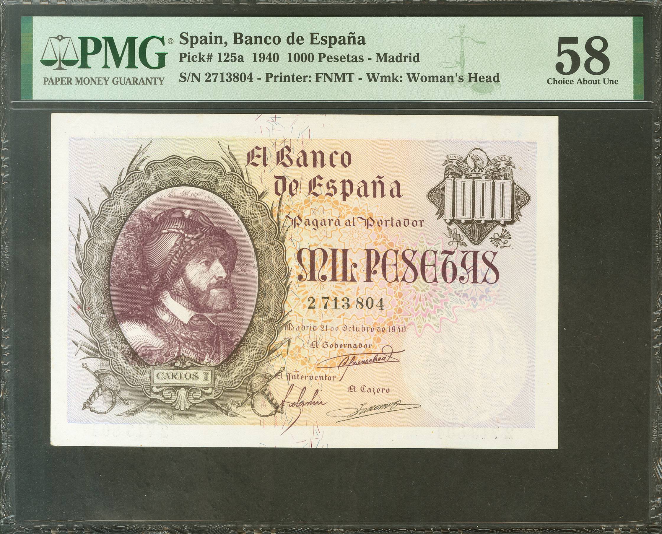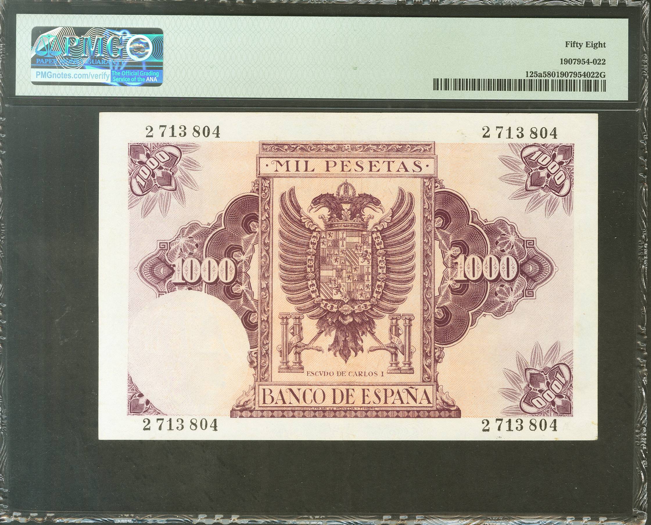 1000 Pesetas. 21 de Octubre de 1940. Sin serie. (Edifil 2017: 445). Rarísimo en esta calidad. EBC+. Encapsulado PMG58.