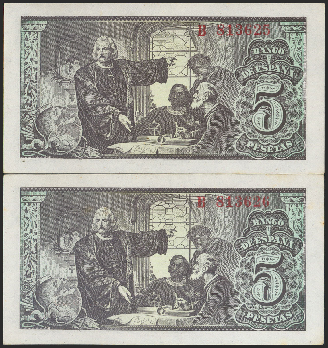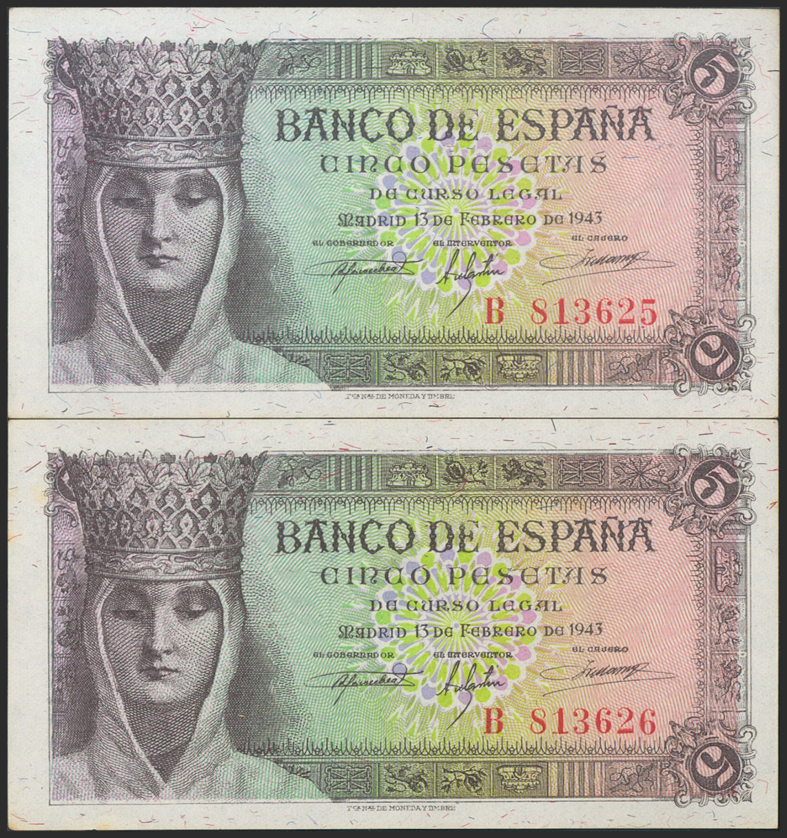 5 Pesetas. 13 de Febrero de 1943. Pareja correlativa. Serie B. (Edifil 2017: 446a). Conserva todo su apresto original, un billete pequeños puntitos. SC-.