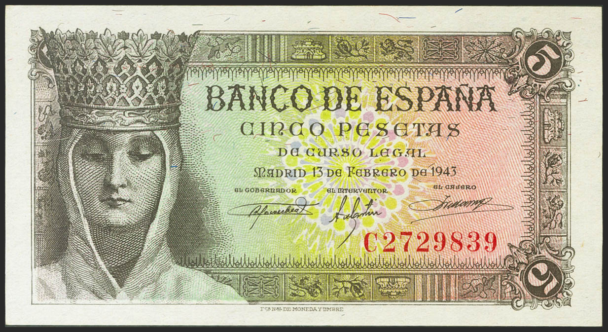 5 Pesetas. 13 de Febrero de 1943. Serie C. (Edifil 2021: 446a). Conserva gran parte de su apresto original. EBC++.