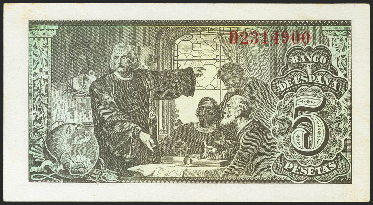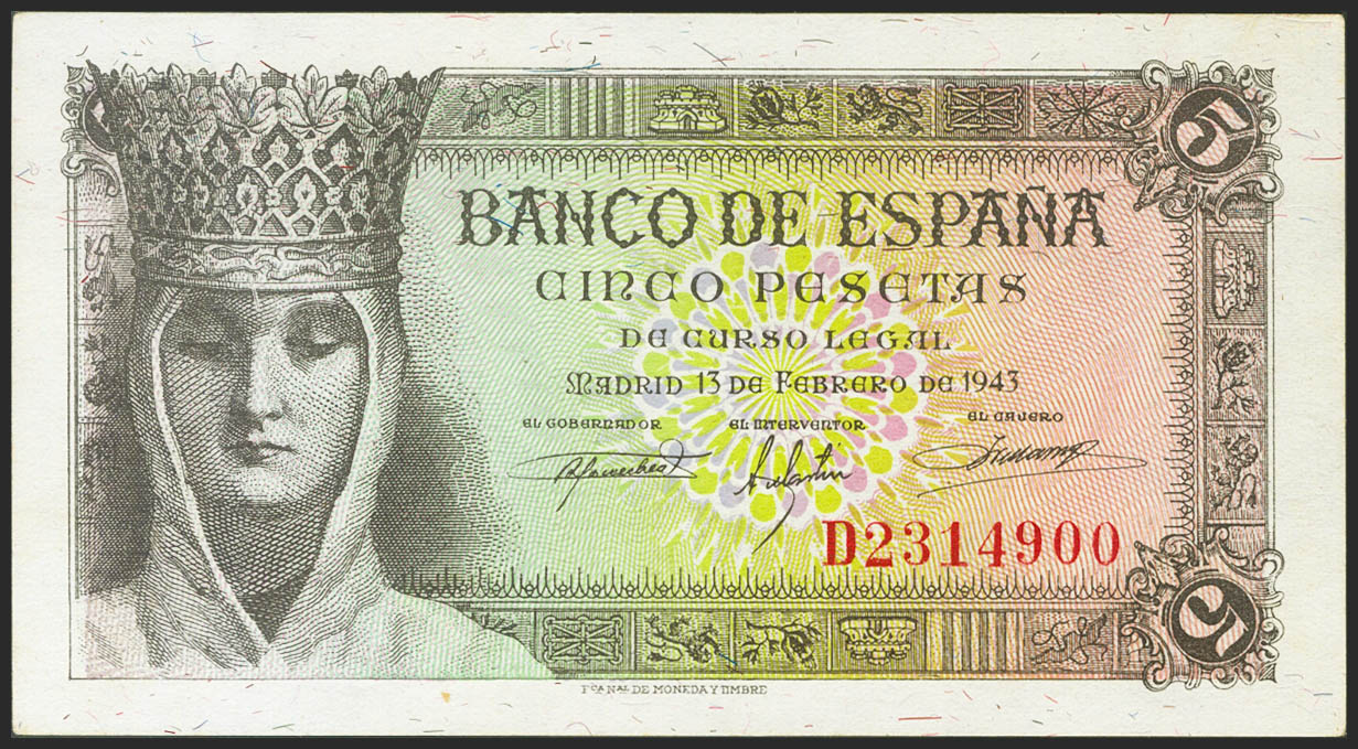 5 Pesetas. 13 de Febrero de 1943. Serie D. (Edifil 2021: 446a). Apresto original. SC-.