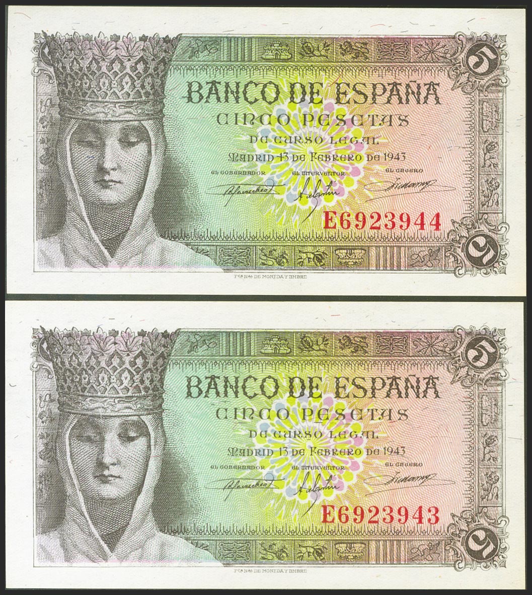1 Peseta. 13 de Febrero de 1943. Pareja correlativa. Serie E. (Edifil 2021: 446a). Conserva todo su apresto original. SC-.