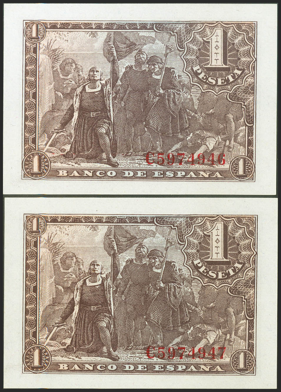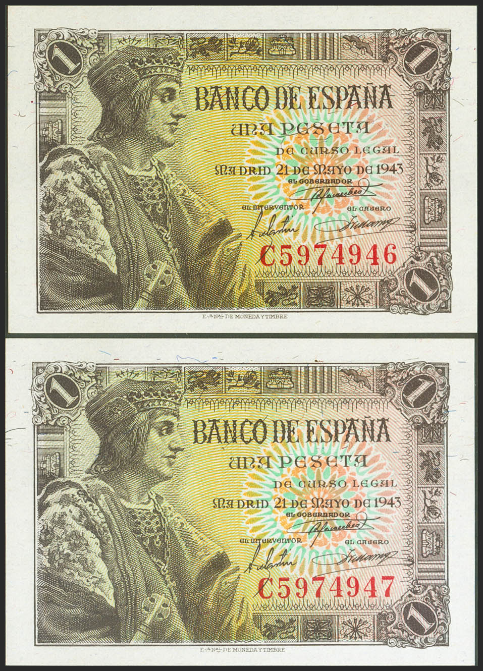 1 Peseta. 21 de Mayo de 1943. Pareja correlativa. Serie C. (Edifil 2021: 447a). Apresto original. SC.