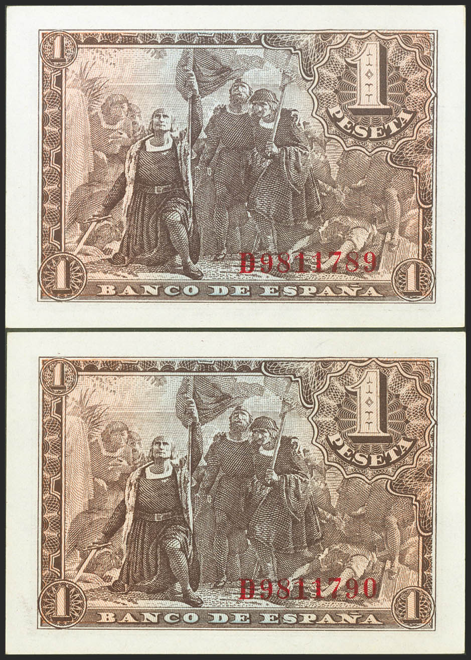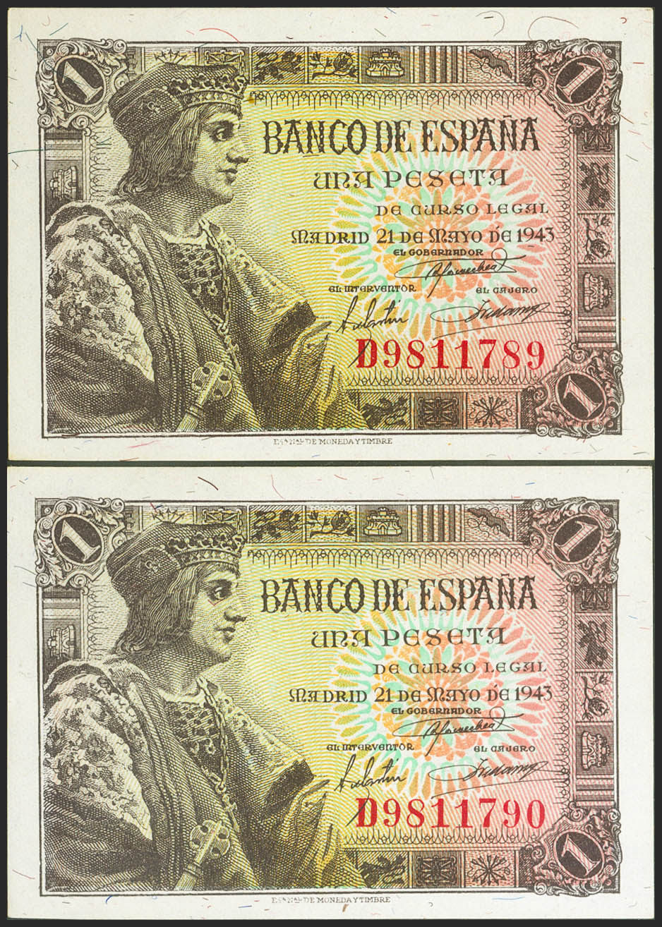 1 Peseta. 21 de Mayo de 1943. Pareja correlativa. Serie D. (Edifil 2021: 447a). Apresto original. SC.