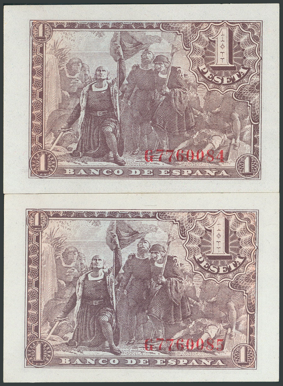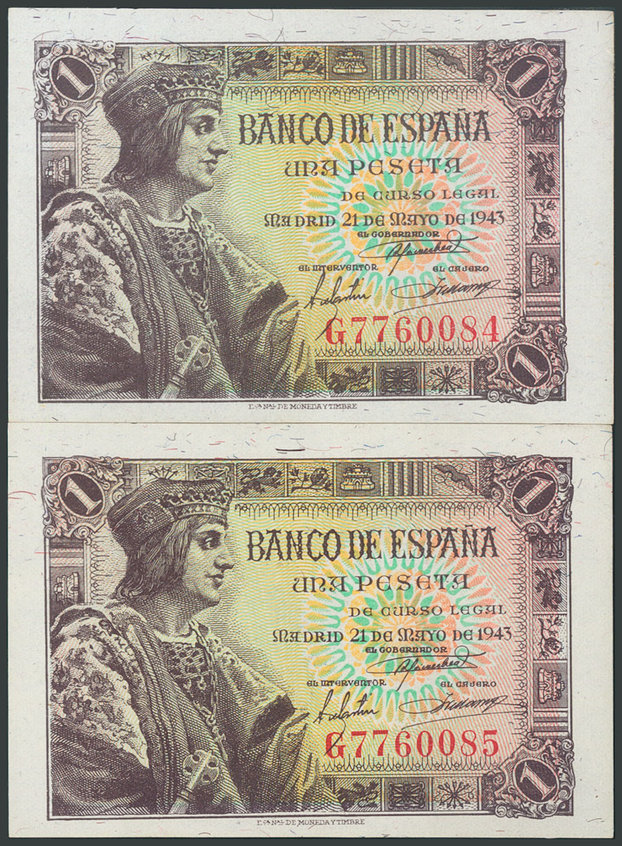 1 Peseta. 21 de Mayo de 1943. Pareja correlativa. Serie G. (Edifil 2017: 447a). SC.