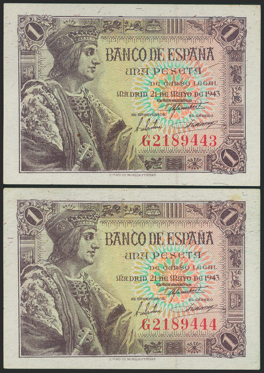 1 Peseta. 21 de Mayo de 1943. Pareja correlativa. Serie G. (Edifil 2021: 447a). Apresto original. SC/SC-.