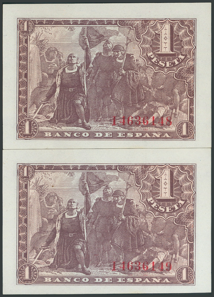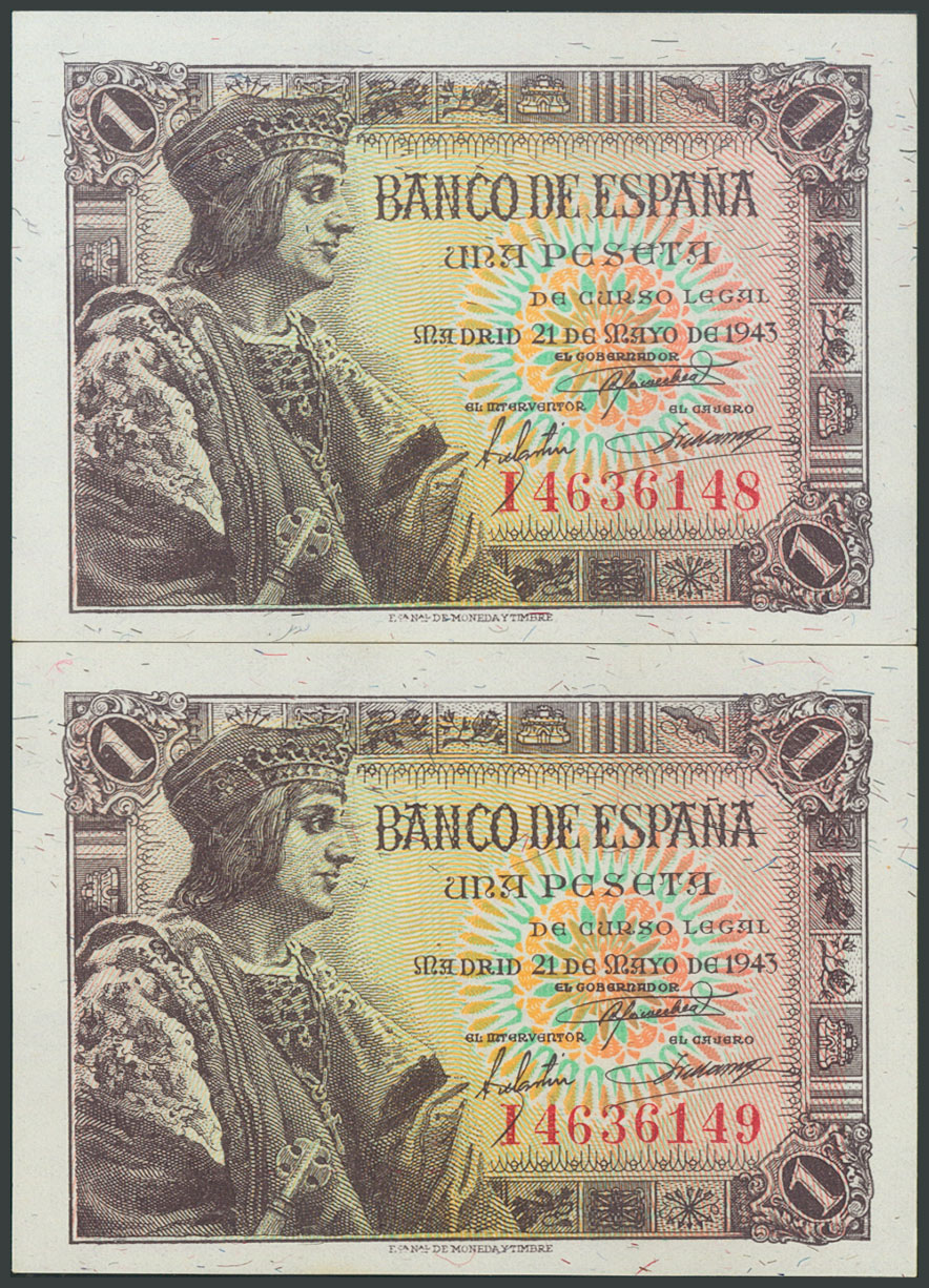 1 Peseta. 21 de Mayo de 1943. Pareja correlativa. Serie I. (Edifil 2017: 447a). SC.