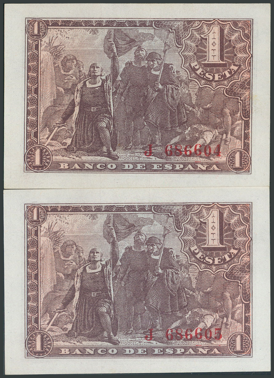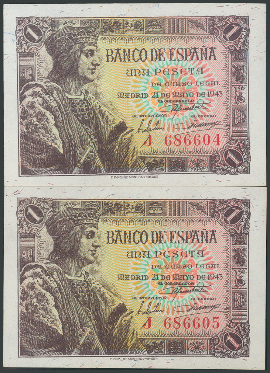 1 Peseta. 21 de Mayo de 1943. Pareja correlativa. Serie J. (Edifil 2017: 447a). SC.