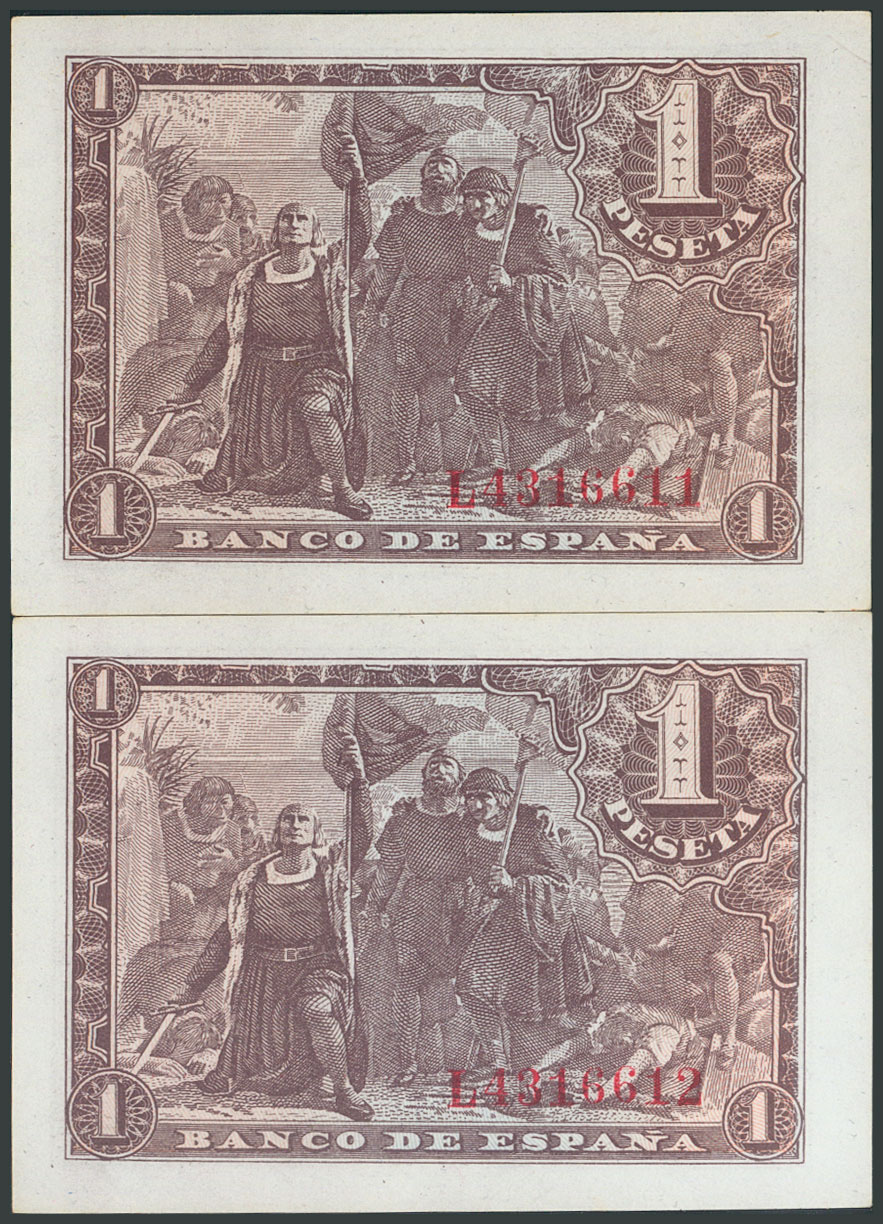1 Peseta. 21 de Mayo de 1943. Pareja correlativa. Serie L. (Edifil 2017: 447a). SC-.