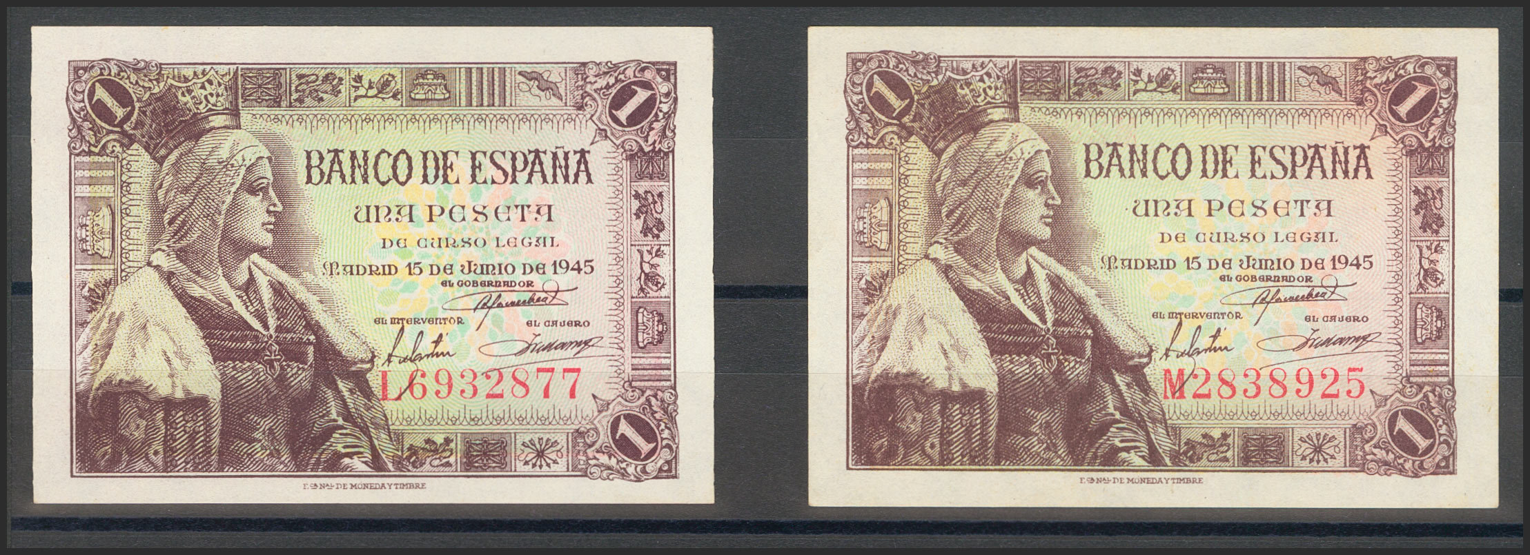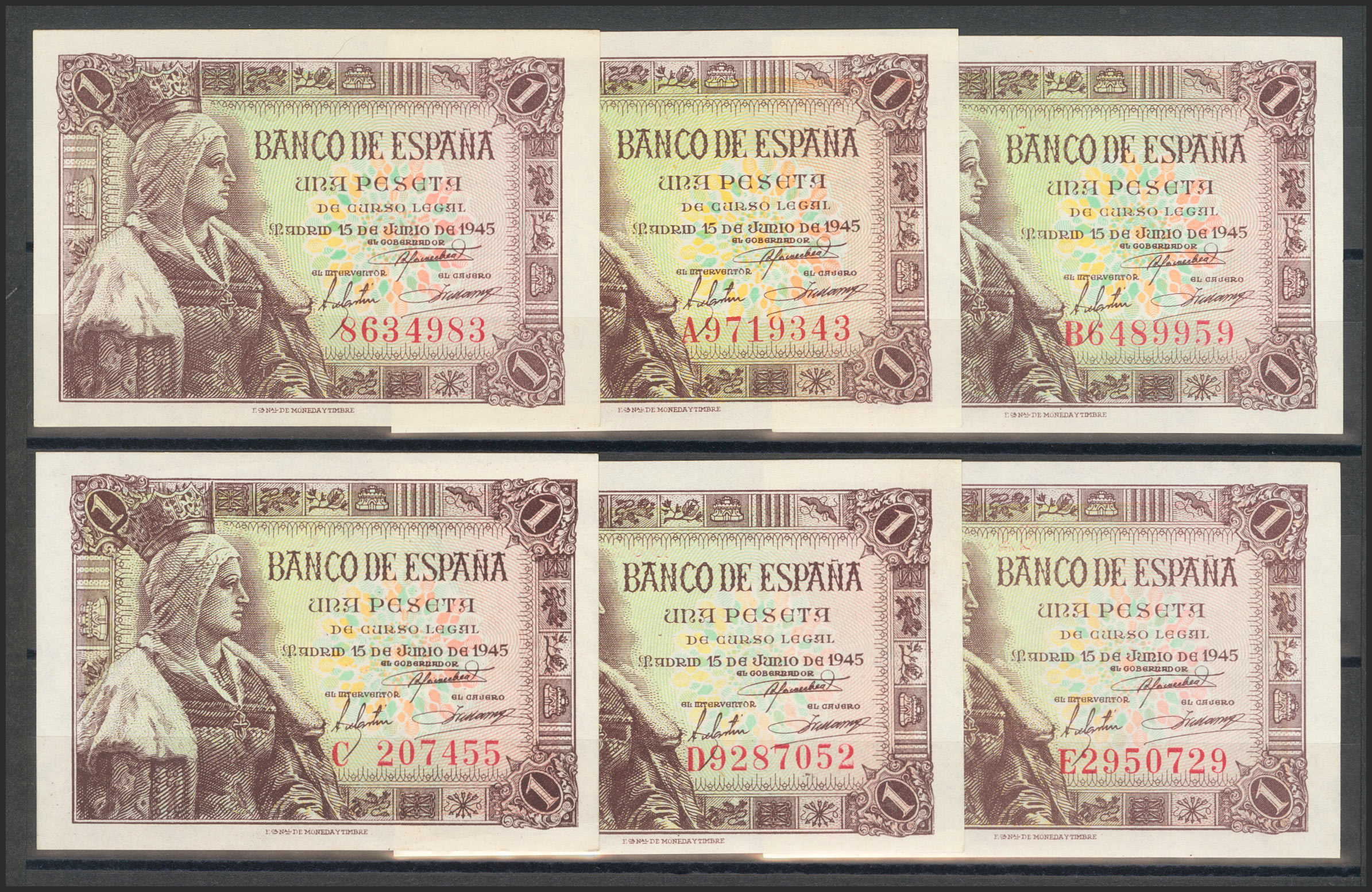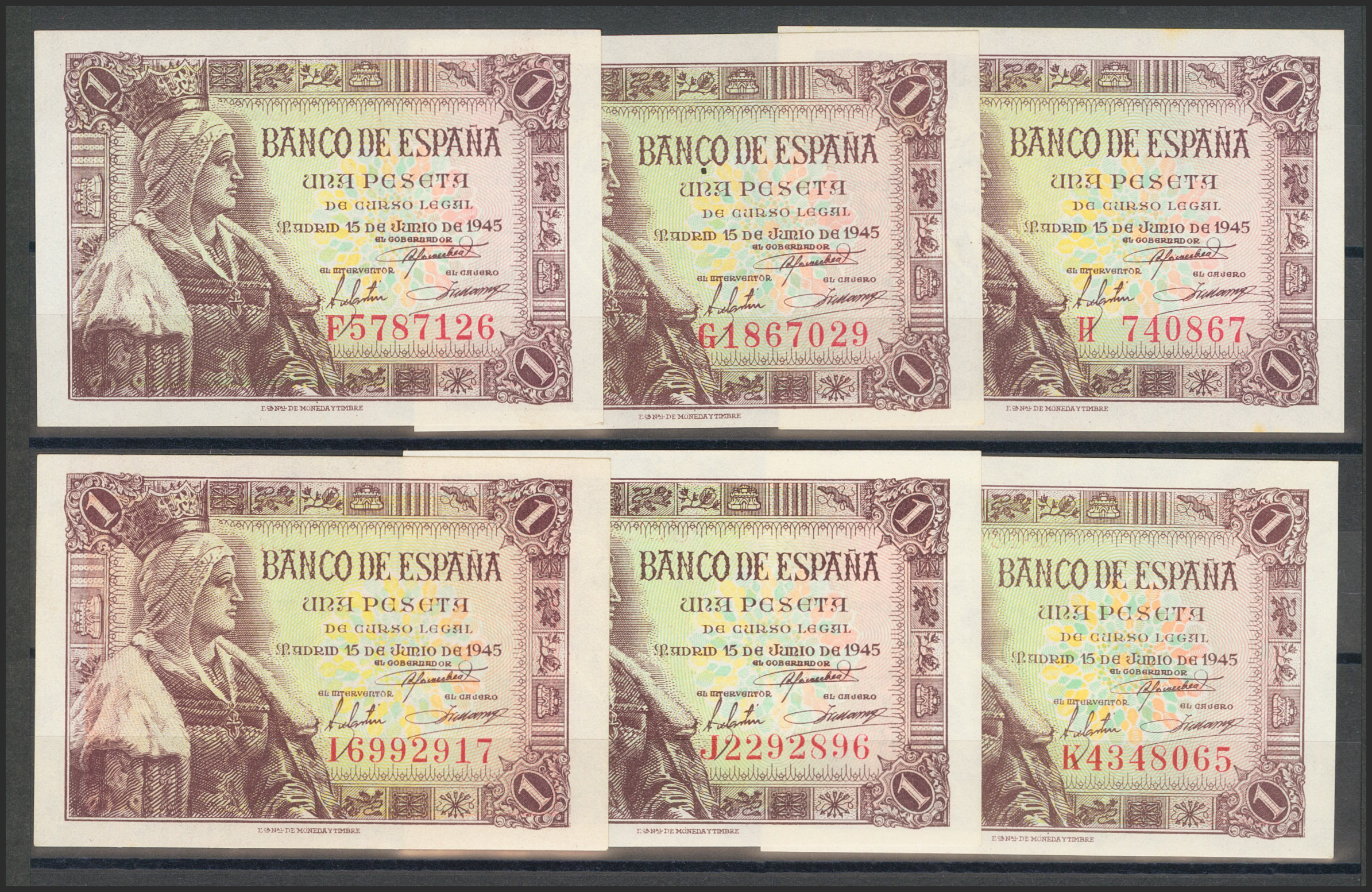 Precioso y muy interesante conjunto de 14 billetes de 1 Peseta emitidos el 15 de Junio de 1945 e incluyendo todas las series conocidas y el sin serie (A, B, C, D, E, F, G, H, I, J, K, L y M)(Edifil 2017: 448, 448a). Raro conjunto y de buena calidad, todos los billetes presentan todo su apresto. SC/SC-.