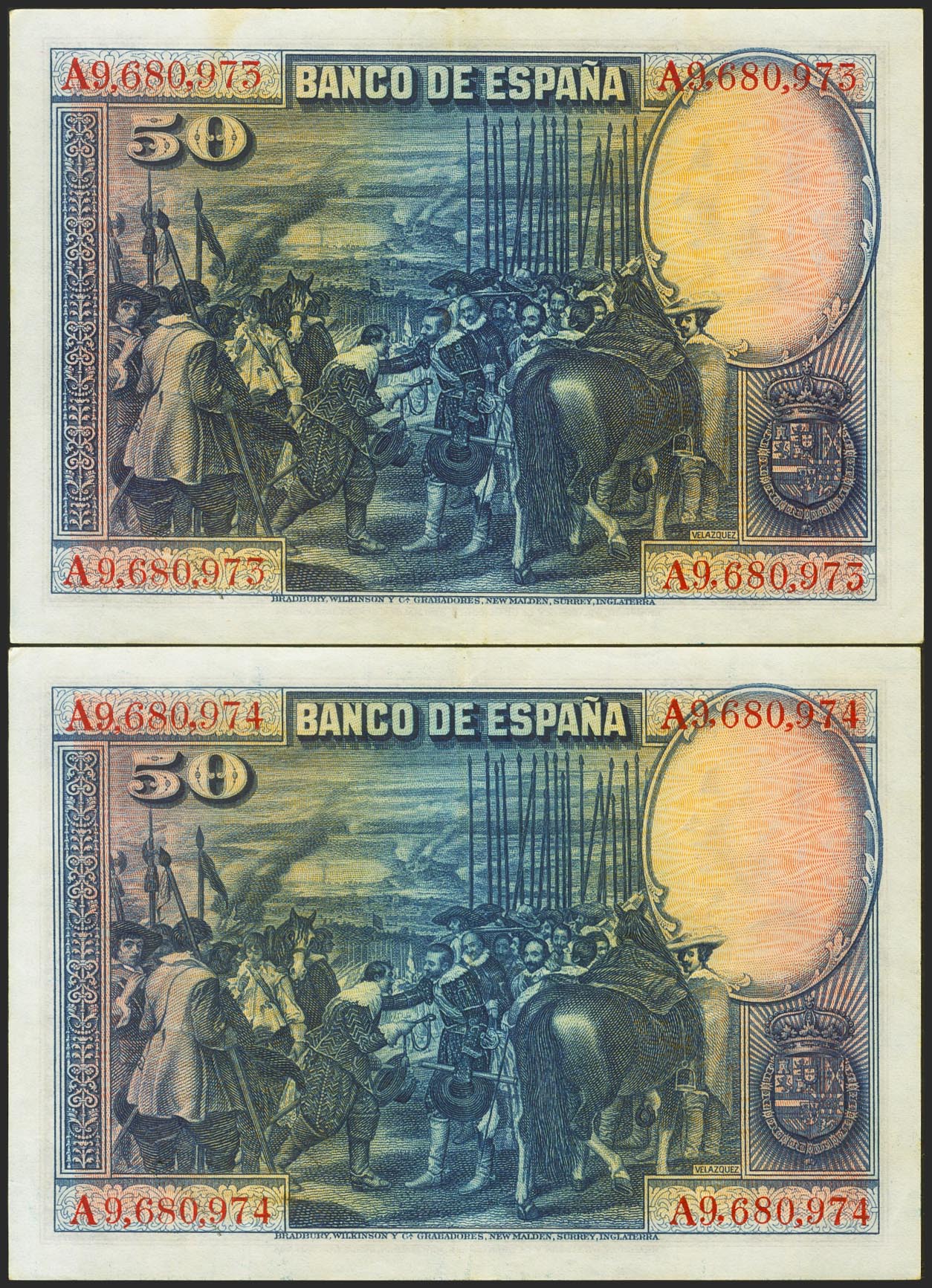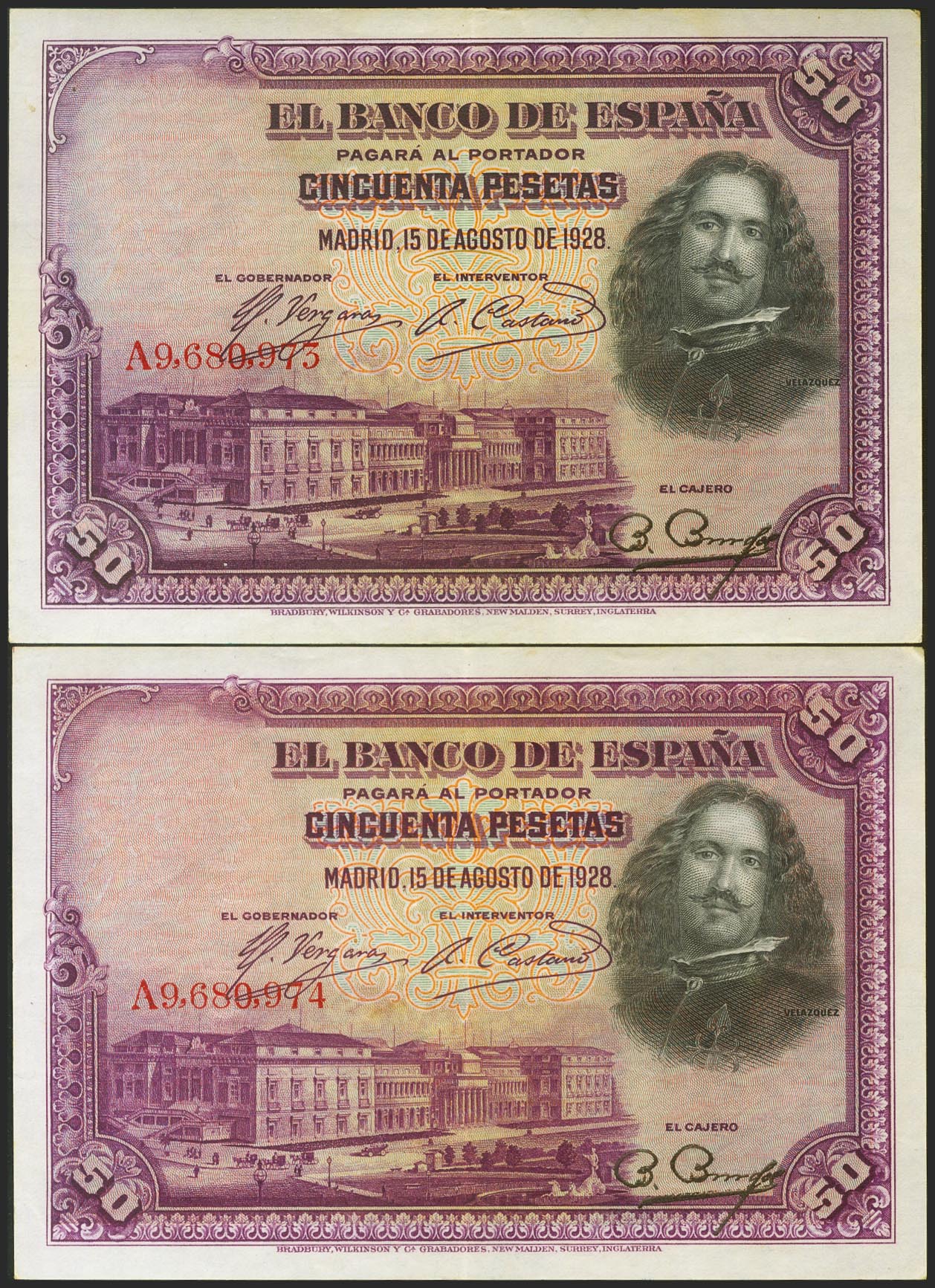 50 Pesetas. 15 de Agosto de 1928. Pareja correlativa. Serie A y numeración posterior al 8640000. (Edifil 2021: 354). Apresto original, inusual serie. EBC.