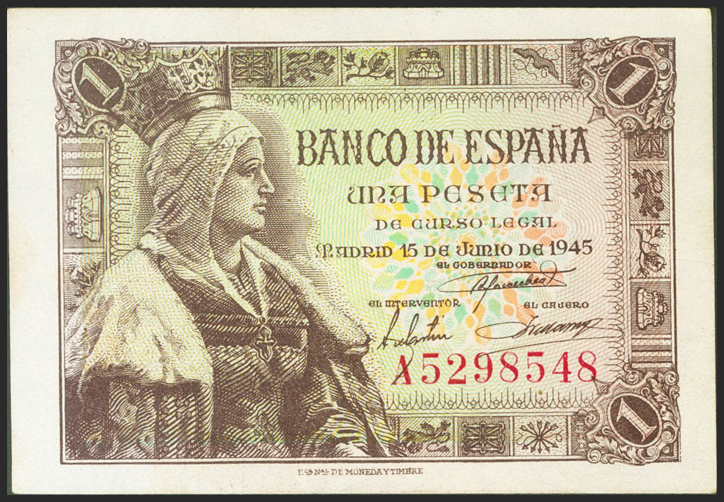 1 Peseta. 15 de Junio de 1945. Serie A. (Edifil 2021: 448a). Apresto original. SC-.