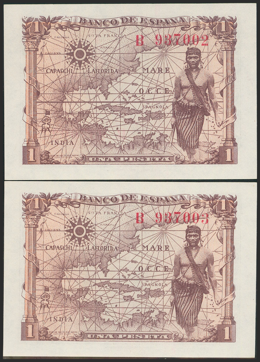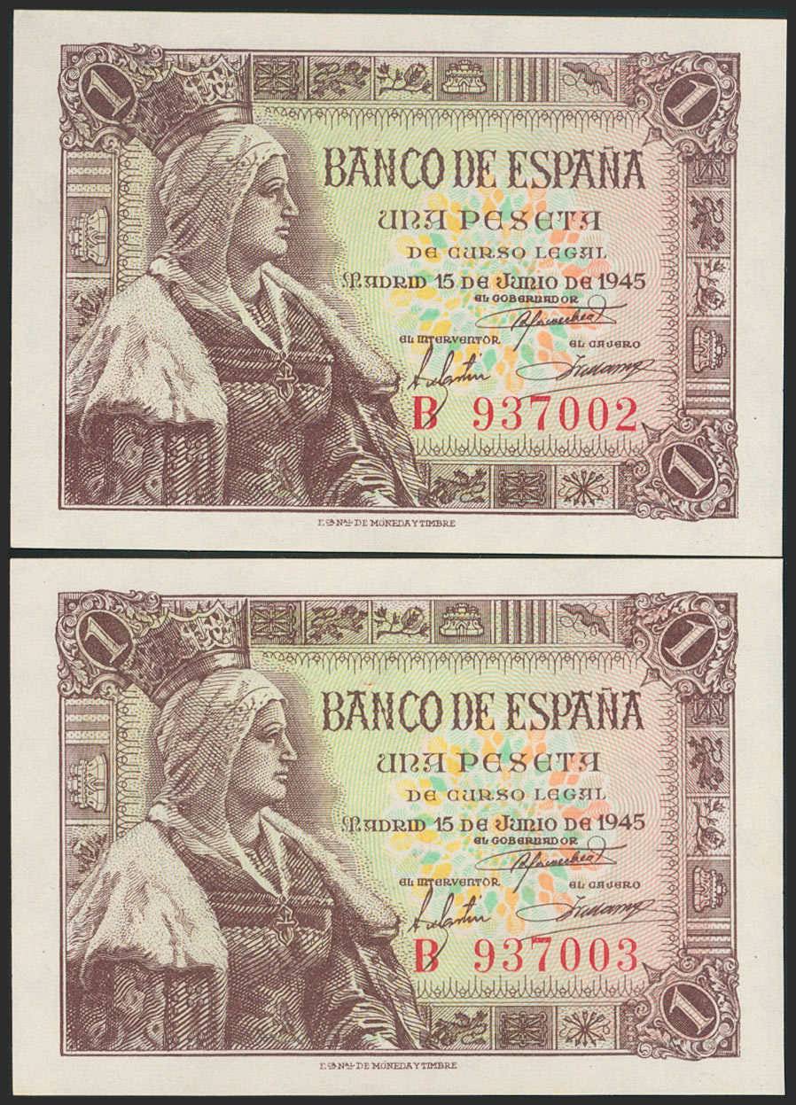 1 Peseta. 15 de Junio de 1945. Pareja correlativa. Serie B. (Edifil 2021: 448a). Apresto original. SC.