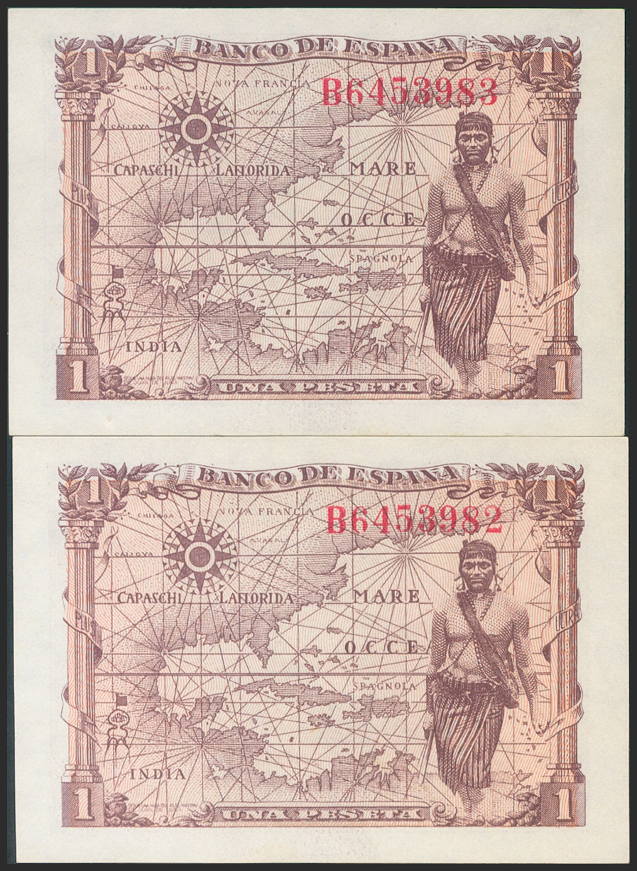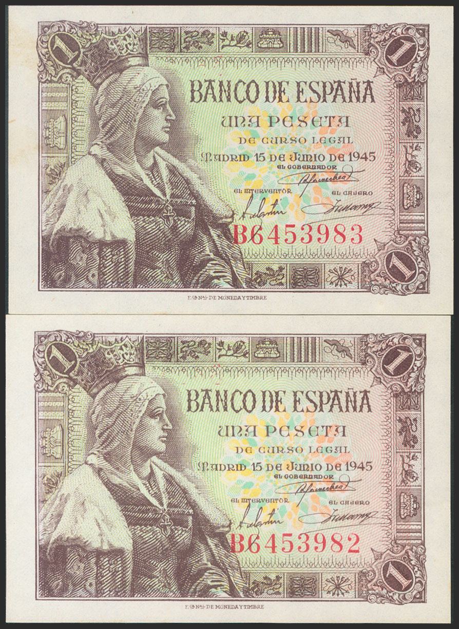 1 Peseta. 15 de Junio de 1945. Pareja correlativa. Serie B. (Edifil 2017: 448a). SC-.