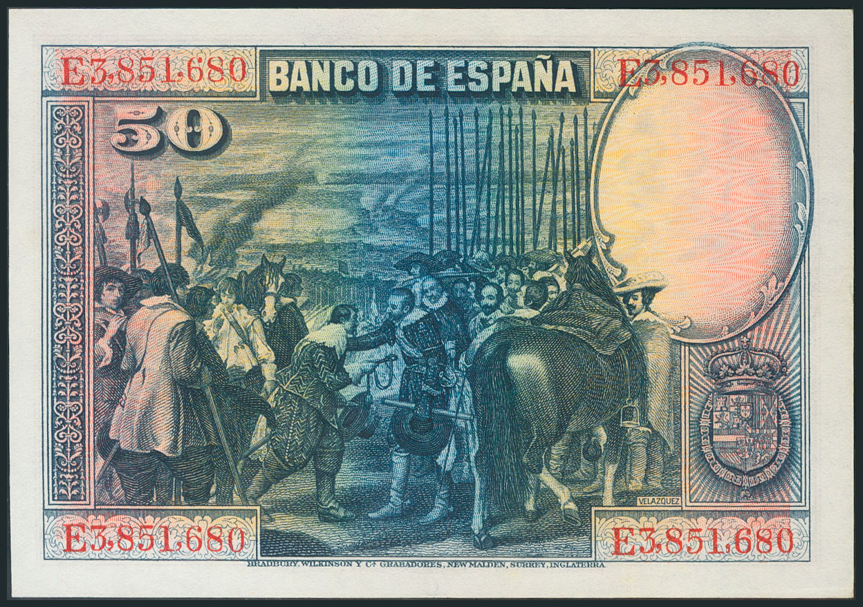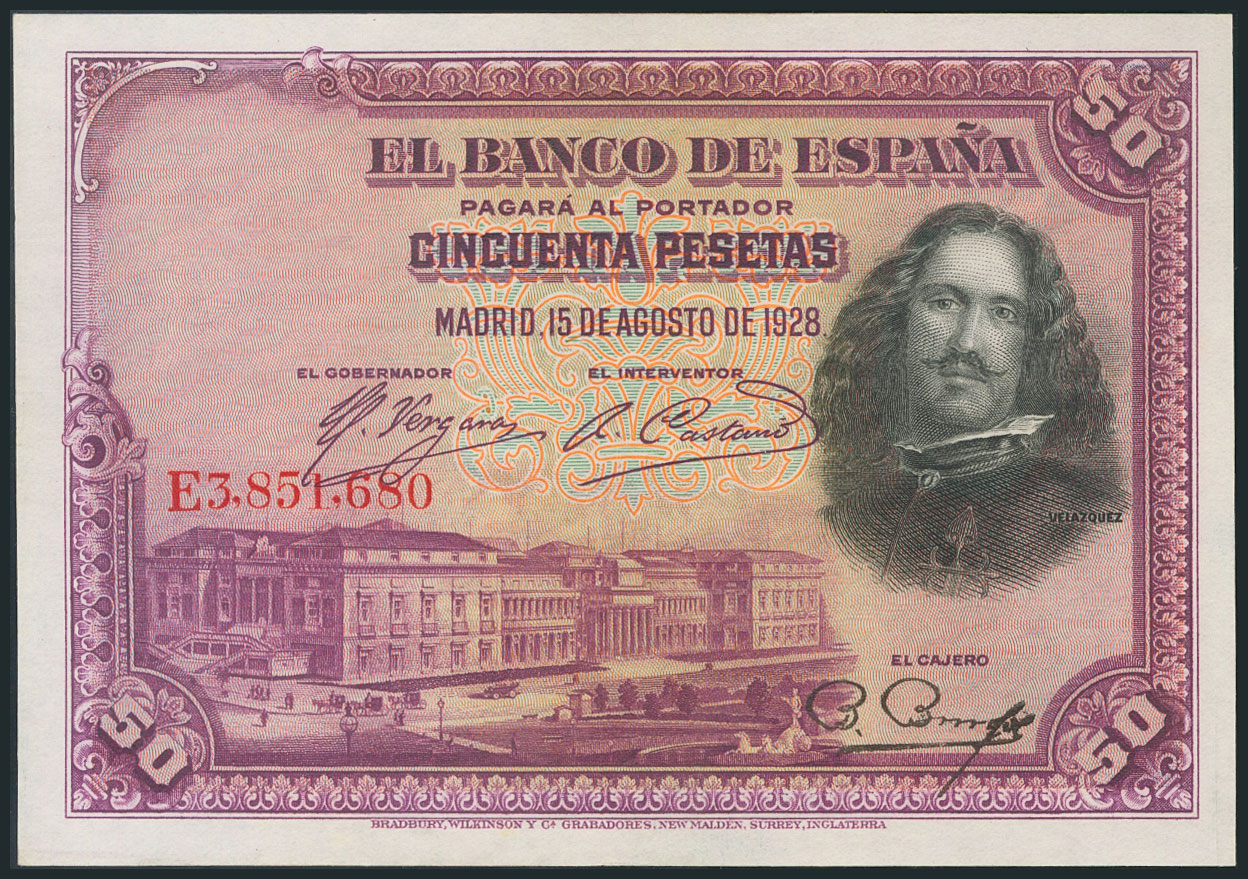 50 Pesetas. 15 de Agosto de 1928. Pareja correlativa. Serie E. (Edifil 2021: 354). Apresto original. SC-.