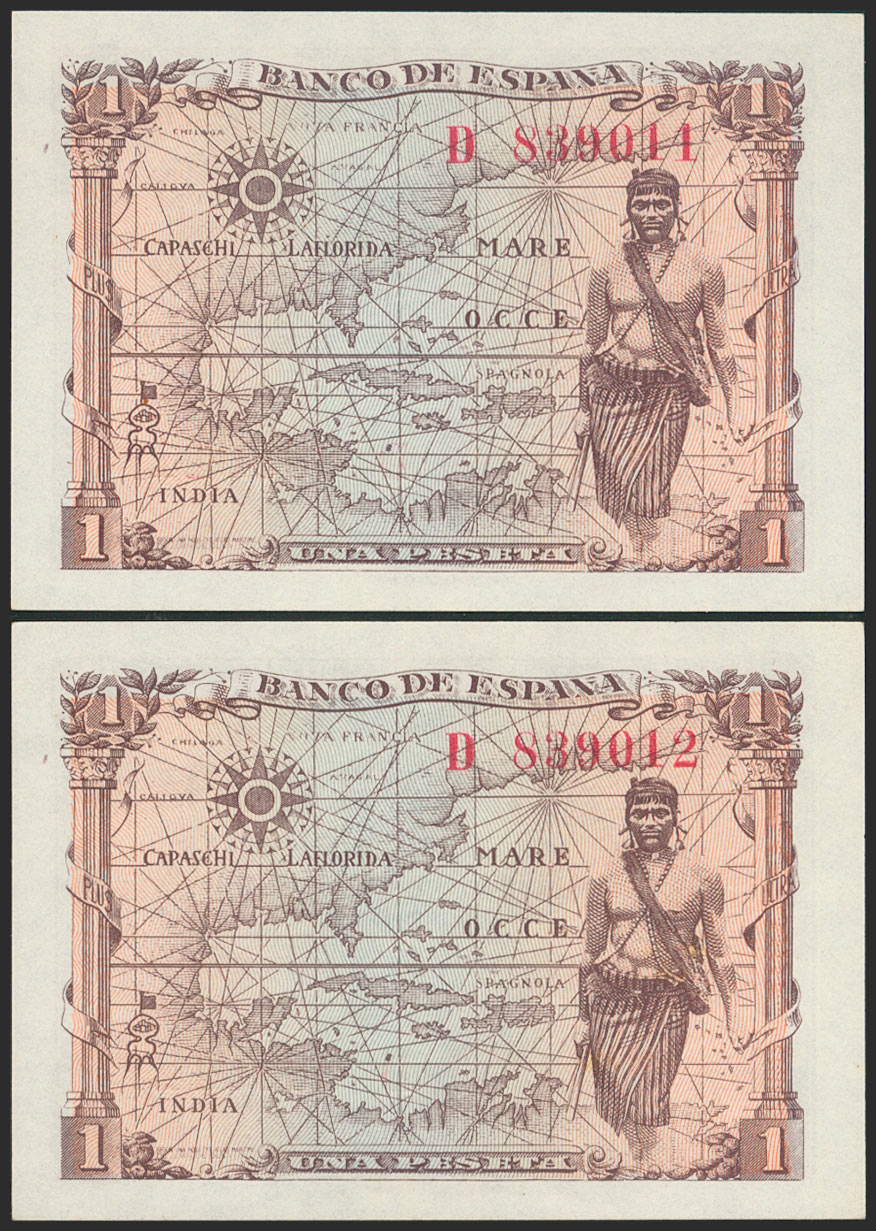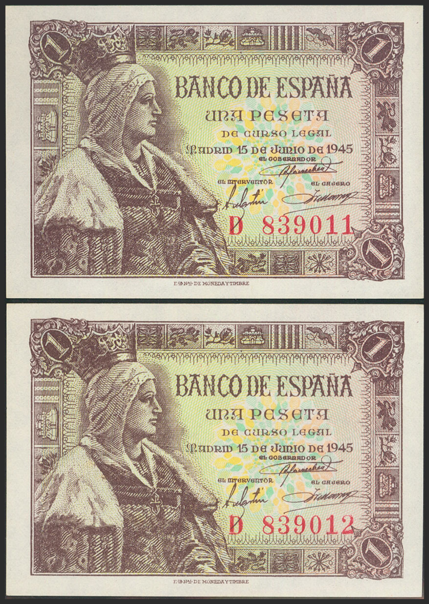 1 Peseta. 15 de Junio de 1945. Pareja correlativa. Serie D. (Edifil 2021: 448a). Apresto original. SC.