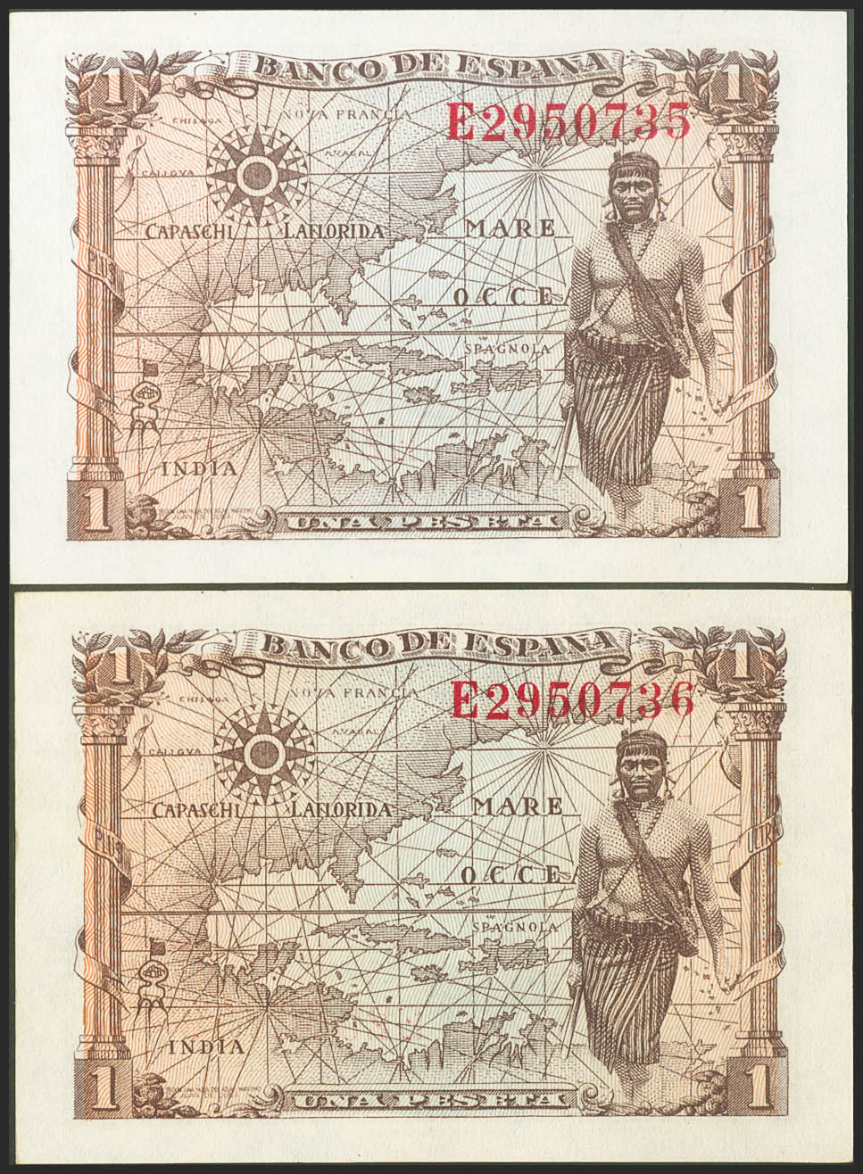 1 Peseta. 15 de Junio de 1945. Pareja correlativa. Serie E. (Edifil 2021: 448a). Apresto original. SC-.