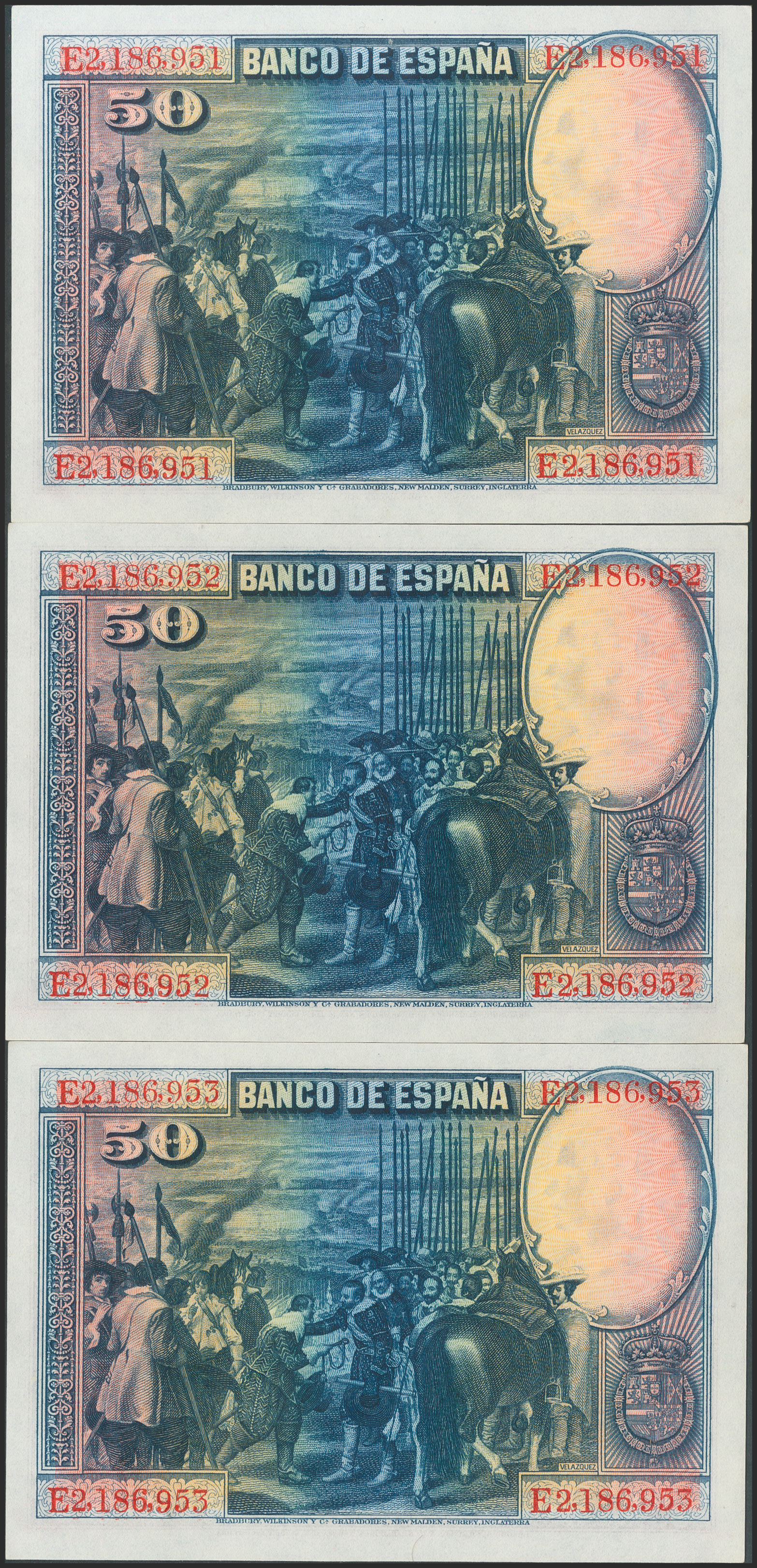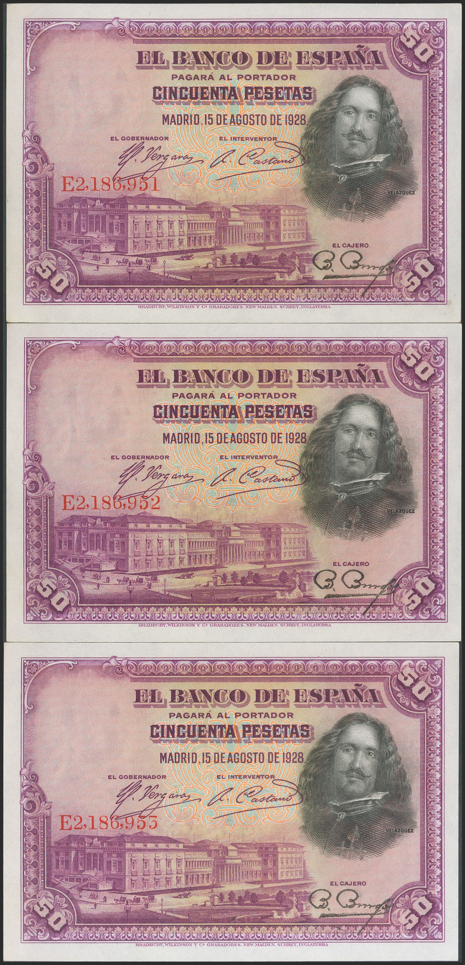 50 Pesetas. 15 de Agosto de 1928. Trío correlativo. Serie E. (Edifil 2017: 354). Conserva todo su apresto original. SC.