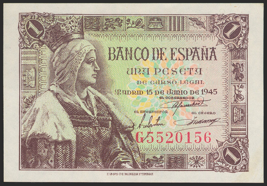 1 Peseta. 15 de Junio de 1945. Serie G. (Edifil 2021: 448a). Apresto original. SC.