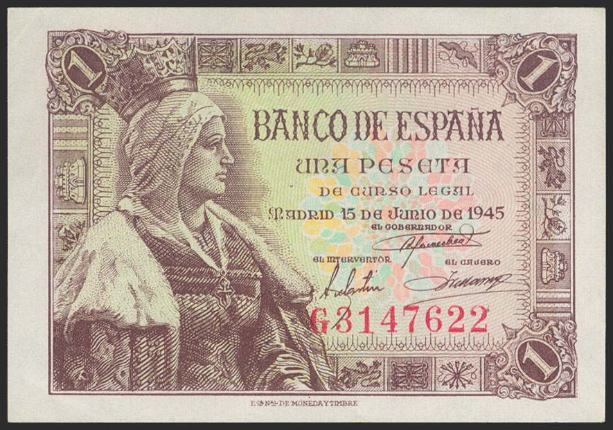 1 Peseta. 15 de Junio de 1945. Serie G. (Edifil 2021: 448a). Apresto original. SC-.