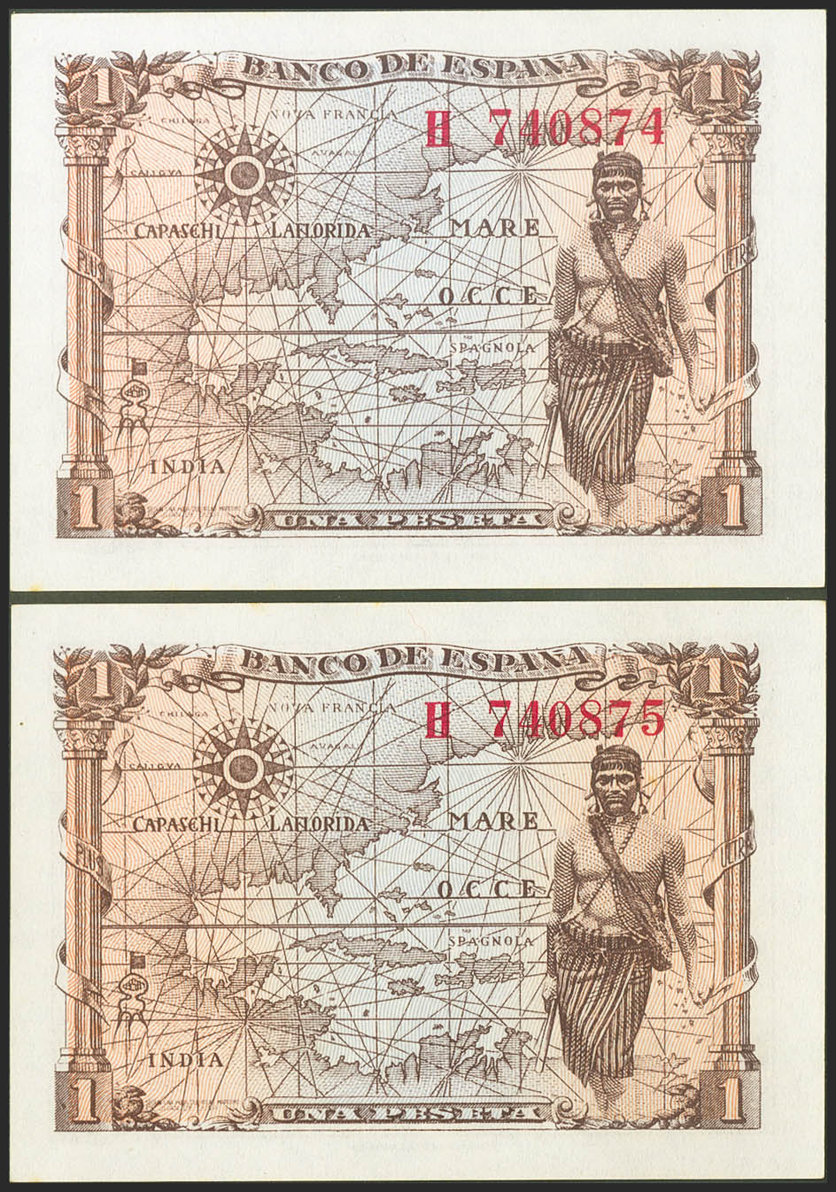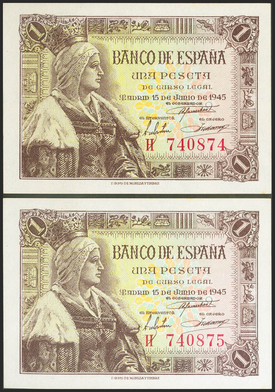 1 Peseta. 15 de Junio de 1945. Pareja correlativa. Serie H. (Edifil 2021: 448a). Apresto original. SC.