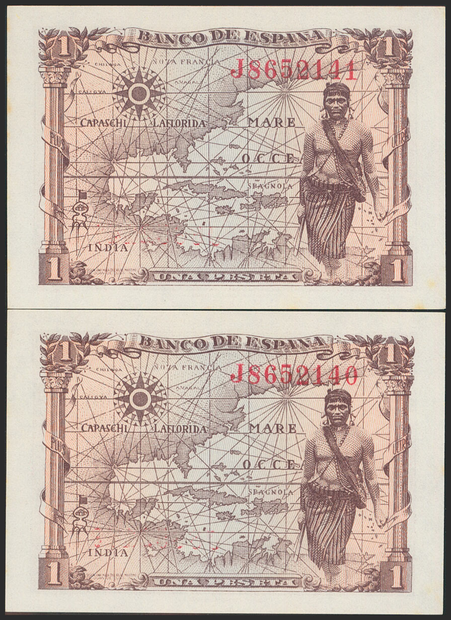 1 Peseta. 15 de Junio de 1945. Pareja correlativa. Serie J. (Edifil 2021: 448a). Apresto original. SC/SC-.