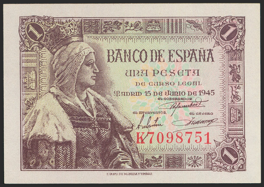 1 Peseta. 15 de Junio de 1945. Serie K. (Edifil 2021: 448a). Apresto original. SC.