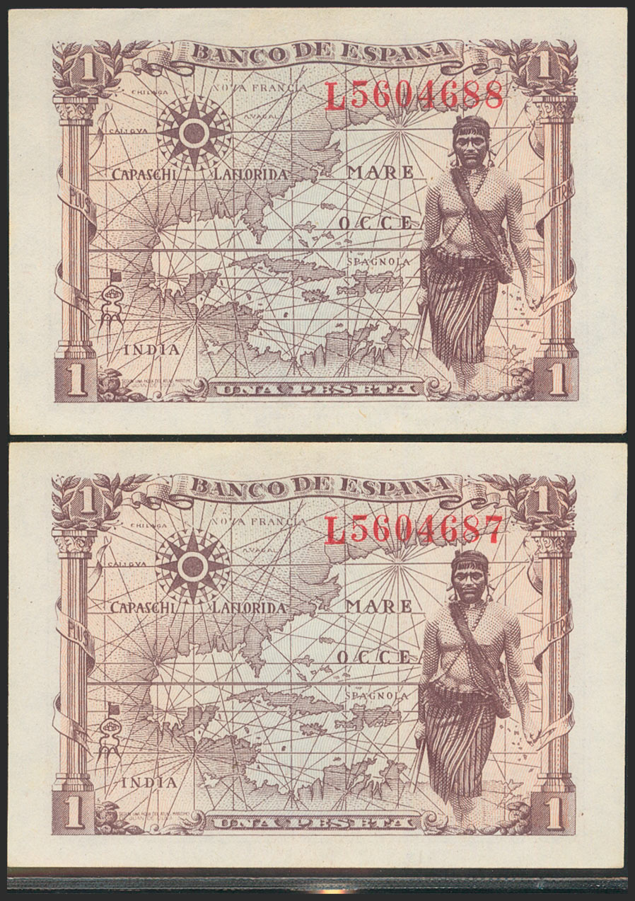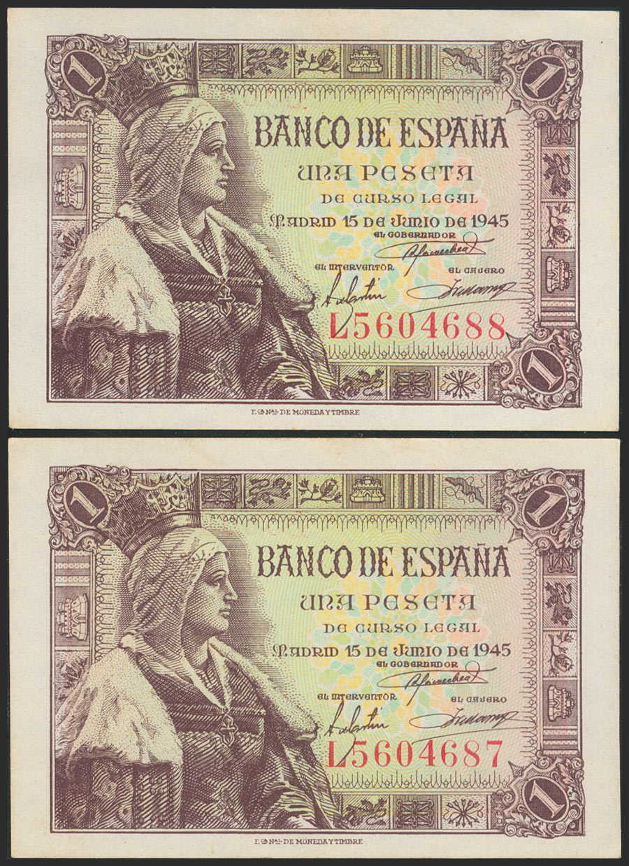 1 Peseta. 15 de Junio de 1945. Pareja correlativa. Serie L. (Edifil 2021: 448a). Apresto original. SC/SC-.
