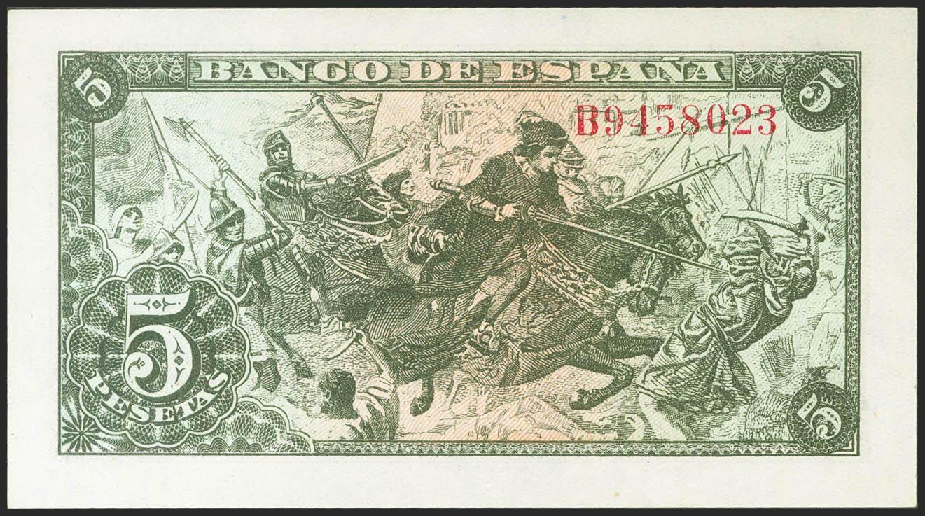 5 Pesetas. 15 de Junio de 1945. Serie B. (Edifil 2021: 449a). Apresto original. SC-.