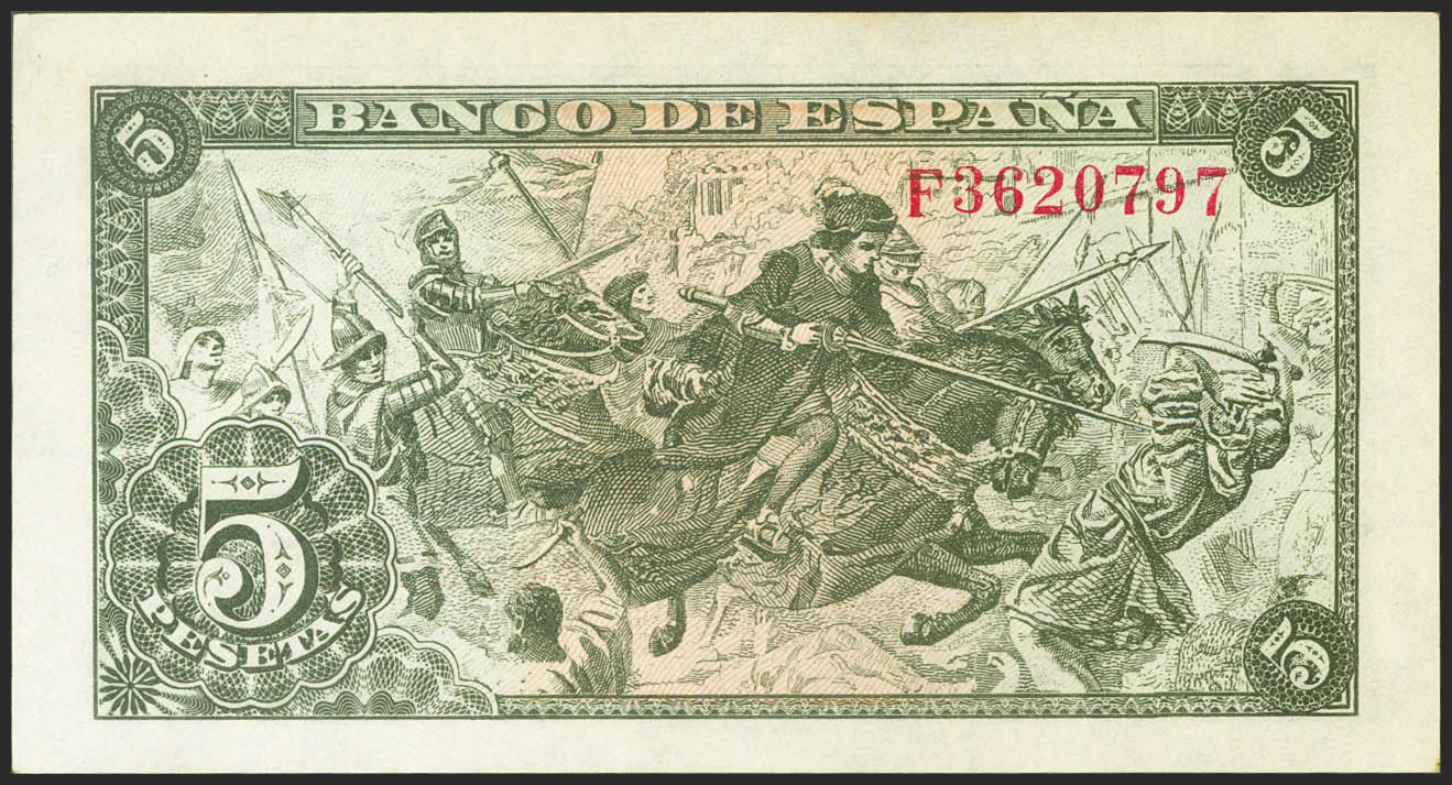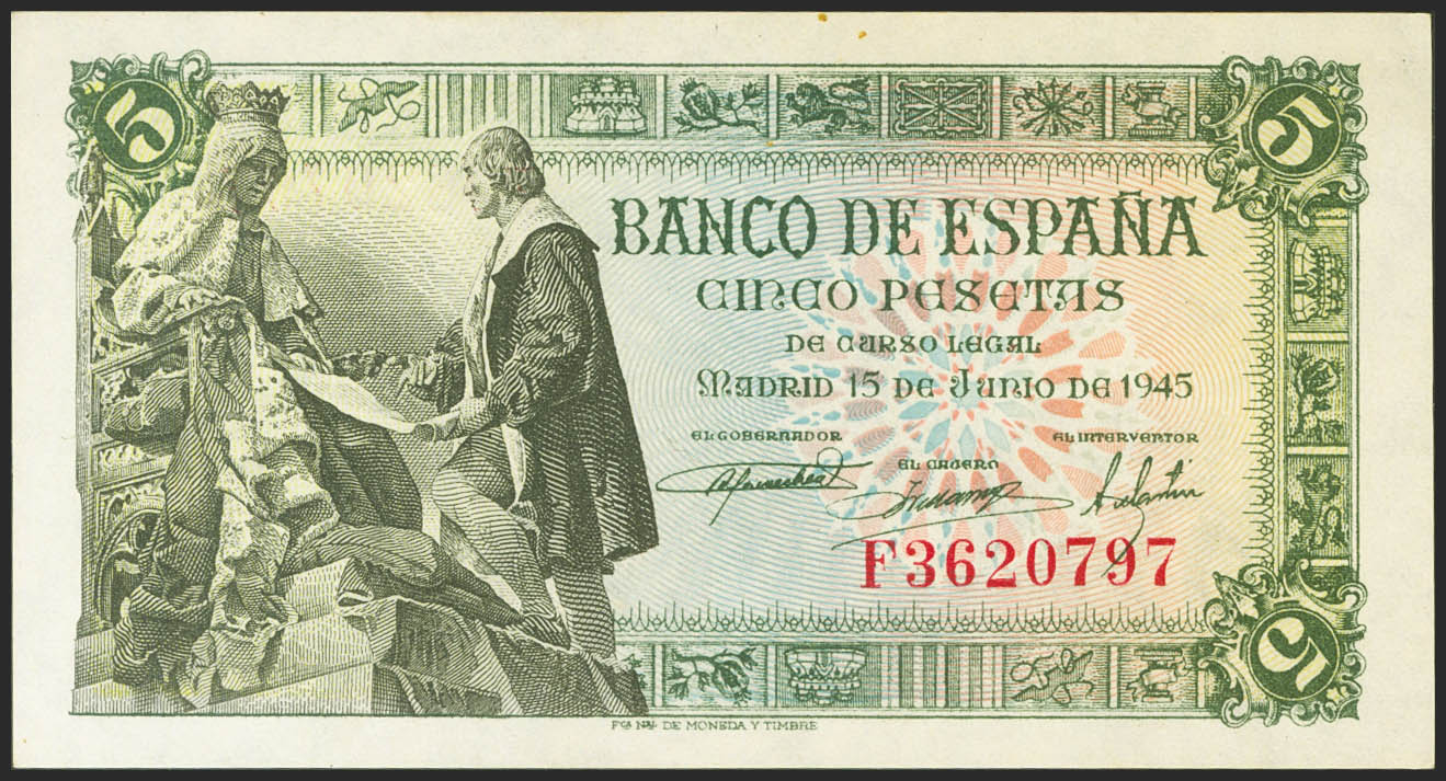 5 Pesetas. 15 de Junio de 1945. Serie F. (Edifil 2021: 449a). Apresto original. SC-.