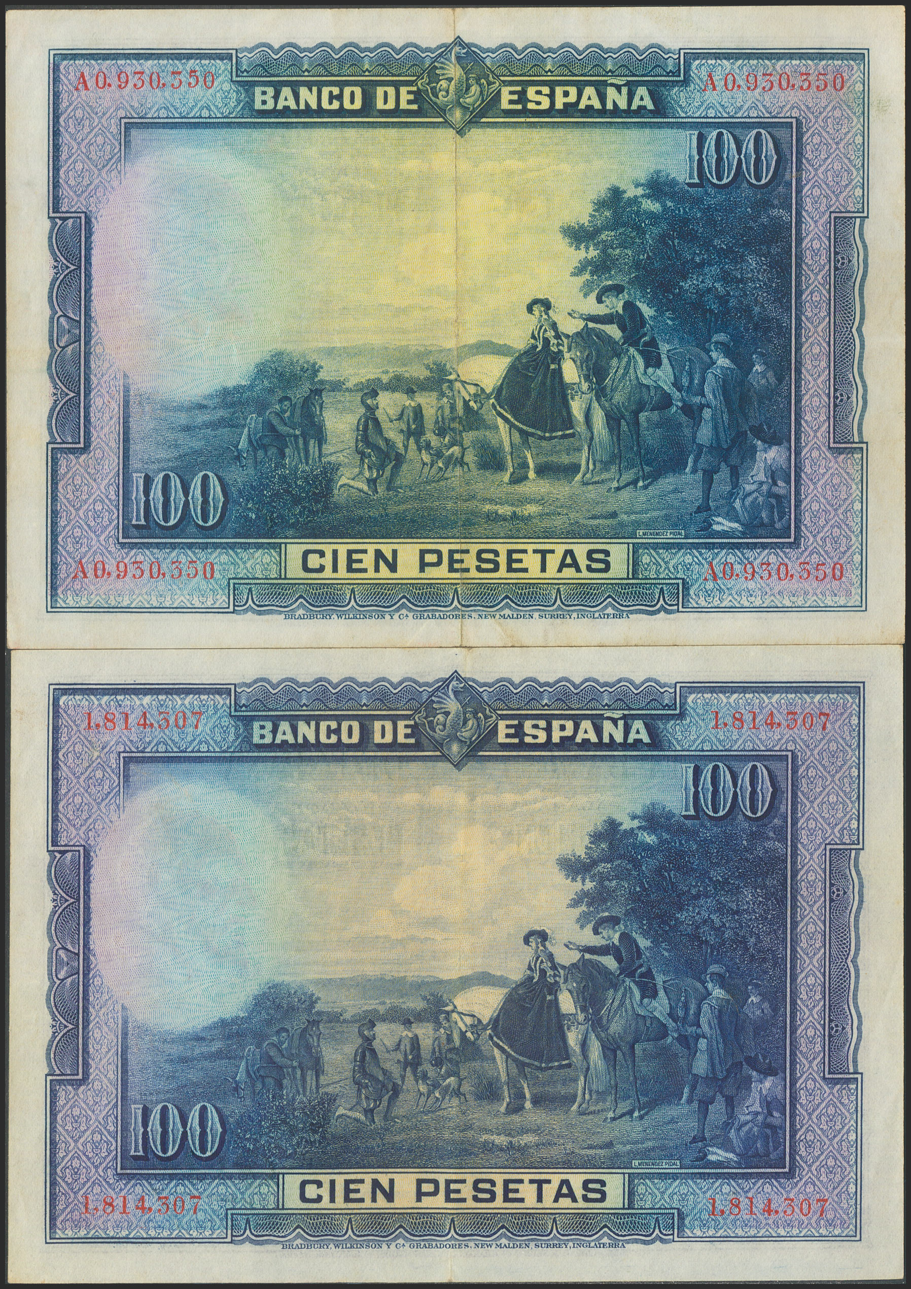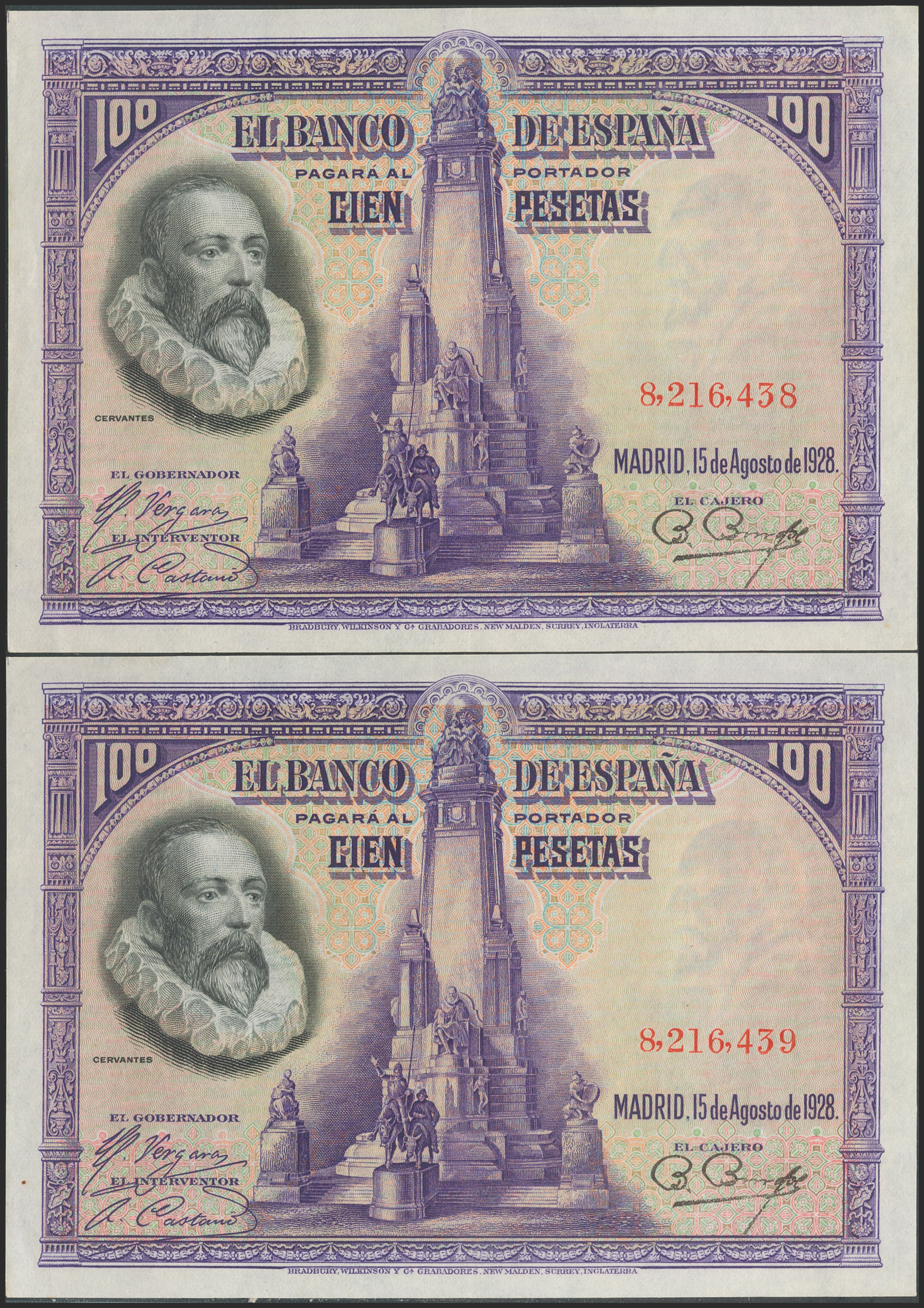100 Pesetas. 15 de Agosto de 1928. Pareja correlativa. Sin serie. (Edifil 2021: 355). Conserva gran parte del apresto original. EBC+.