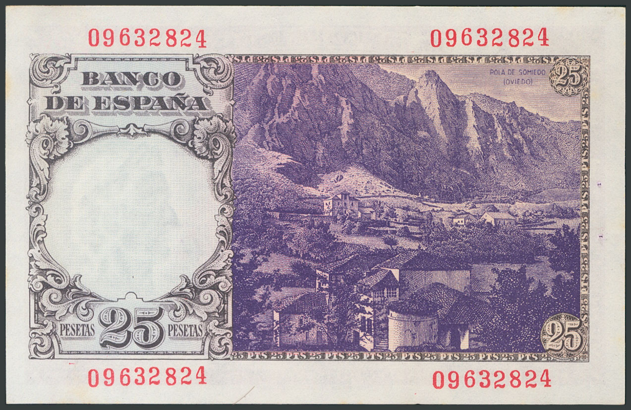 25 Pesetas. 19 de Febrero de 1946. Sin serie. (Edifil 2017: 450). Apresto original, puntitos de grapa y algunos puntitos del tiempo. EBC+.