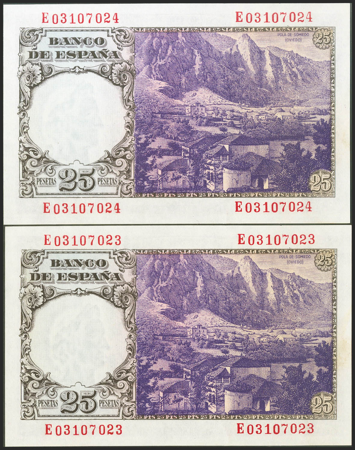 25 Pesetas. 19 de Febrero de 1946. Pareja correlativa, serie E. (Edifil 2021: 450a). Apresto original. SC-.