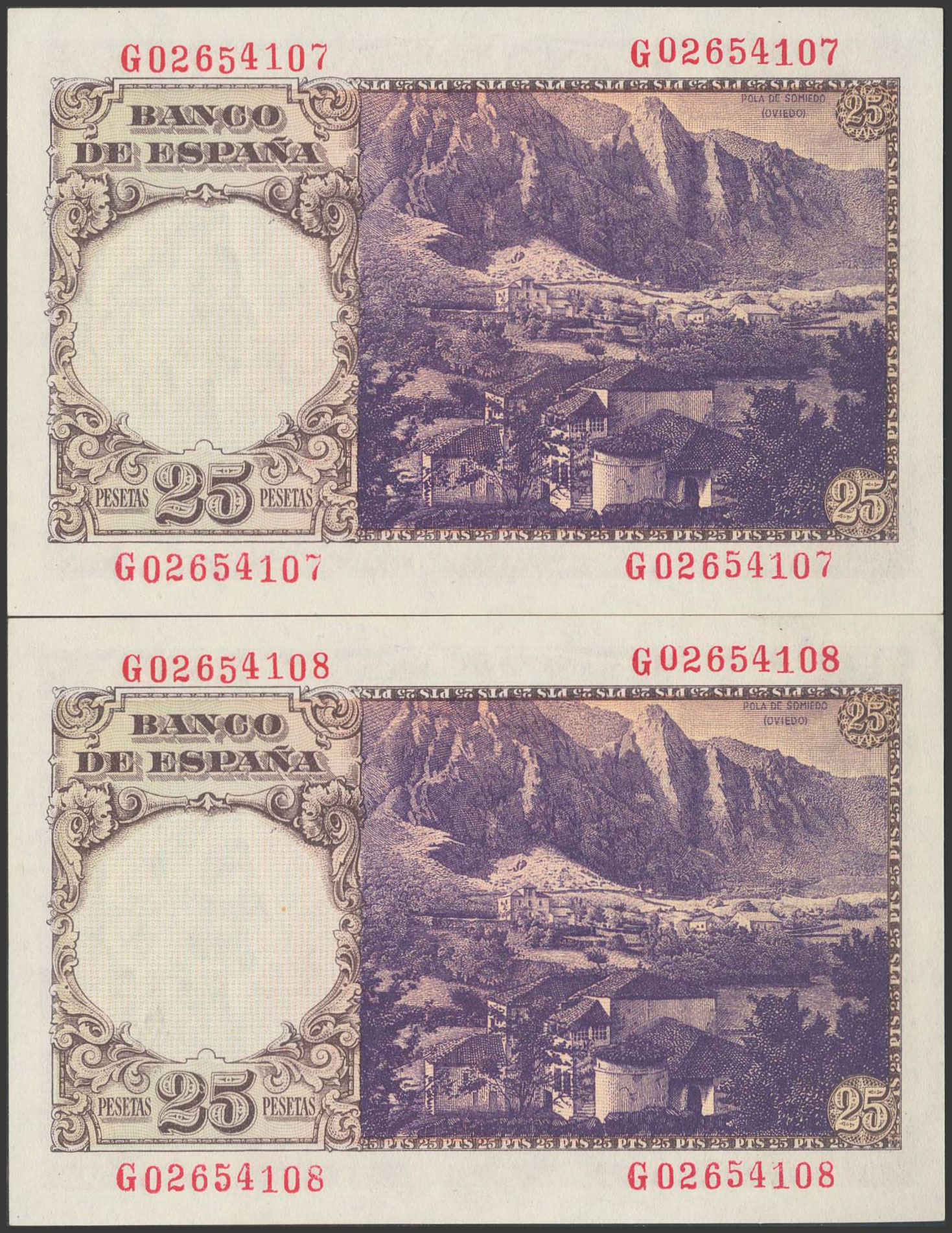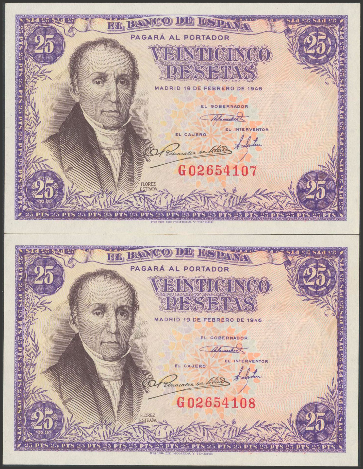 25 Pesetas. 19 de Febrero de 1946. Pareja correlativa. Serie G. (Edifil 2017: 450a). Apresto original. SC.