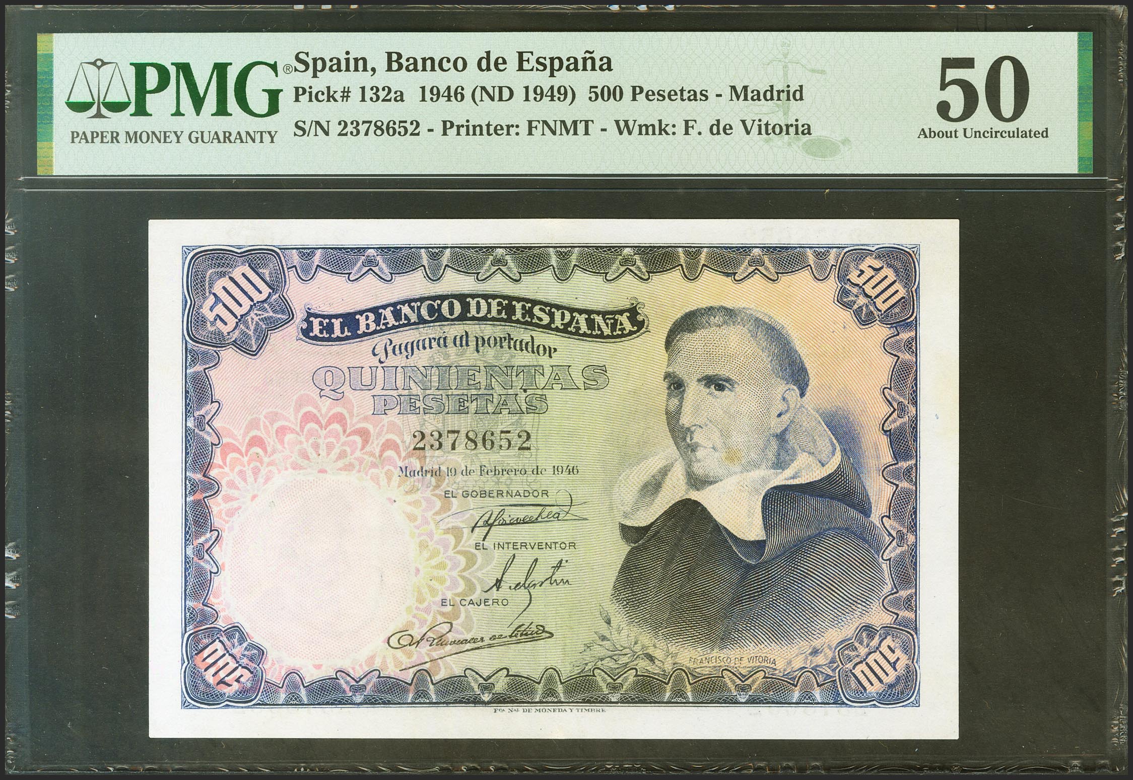 500 Pesetas. 19 de Febrero de 1946. Sin serie. (Edifil 2021: 452, Pick: 132a). Raro en esta calidad. EBC. Encapsulado PMG50.