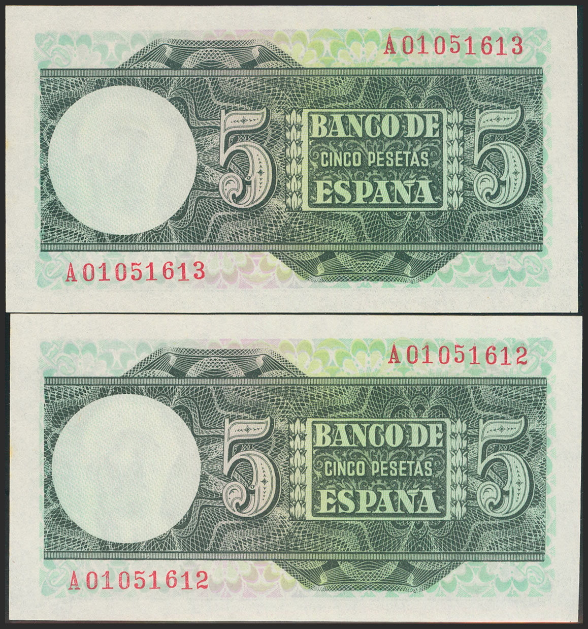 5 Pesetas. 15 de Marzo de 1948. Pareja correlativa. Serie A. (Edifil 2021: 455a). Apresto original. SC.