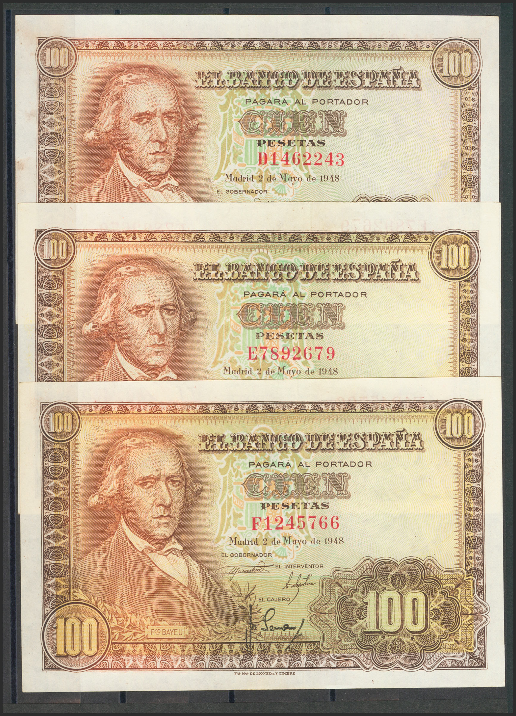 Precioso e interesante conjunto de 10 billetes de 100 Pesetas emitidos el 2 de Mayo de 1948, incluyendo todas las series conocidas y el sin serie (A, B, C, D, E, F, G, H e I)(Edifil 2017: 456, 456a). Rarísimo conjunto de muy buena calidad, todos los billetes conservan su apresto original. SC/SC-.
